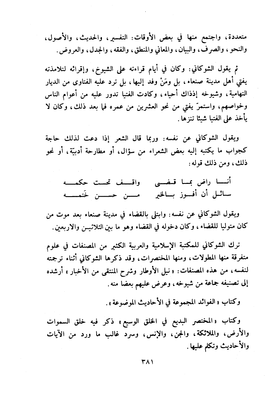 ويقول الشوكاني عن نفسه: وربما قال الشعر إذا دعت لذلك حاجة كجواب ما يكتبه إليه بعض الشعراء من سؤال، أو مطارحة أدبيّة، أو نحو ذلك، ومن ذلك قوله:
