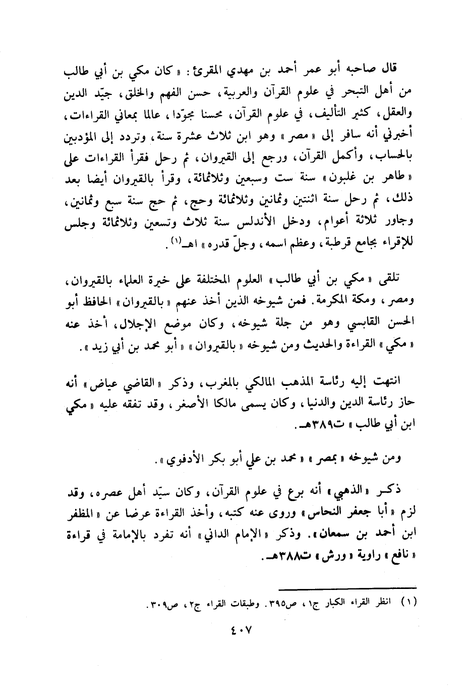 قال صاحبه أبو عمر أحمد بن مهدي المقرئ: «كان مكي بن أبي طالب من أهل التبحر في علوم القرآن والعربية، حسن الفهم والخلق، جيّد الدين والعقل، كثير التأليف، في علوم القرآن، محسنا مجوّدا، عالما بمعاني القراءات، أخبرني أنه سافر إلى «مصر» وهو ابن ثلاث عشرة سنة، وتردد إلى المؤدبين بالحساب، وأكمل القرآن، ورجع إلى القيروان، ثم رحل فقرأ القراءات على «طاهر بن غلبون» سنة ست وسبعين وثلاثمائة، وقرأ بالقيروان أيضا بعد ذلك، ثم رحل سنة اثنتين وثمانين وثلاثمائة وحج، ثم حج سنة سبع وثمانين، وجاور ثلاثة أعوام، ودخل الأندلس سنة ثلاث وتسعين وثلاثمائة وجلس للإقراء بجامع قرطبة، وعظم اسمه، وجلّ قدره» اه (¬1).