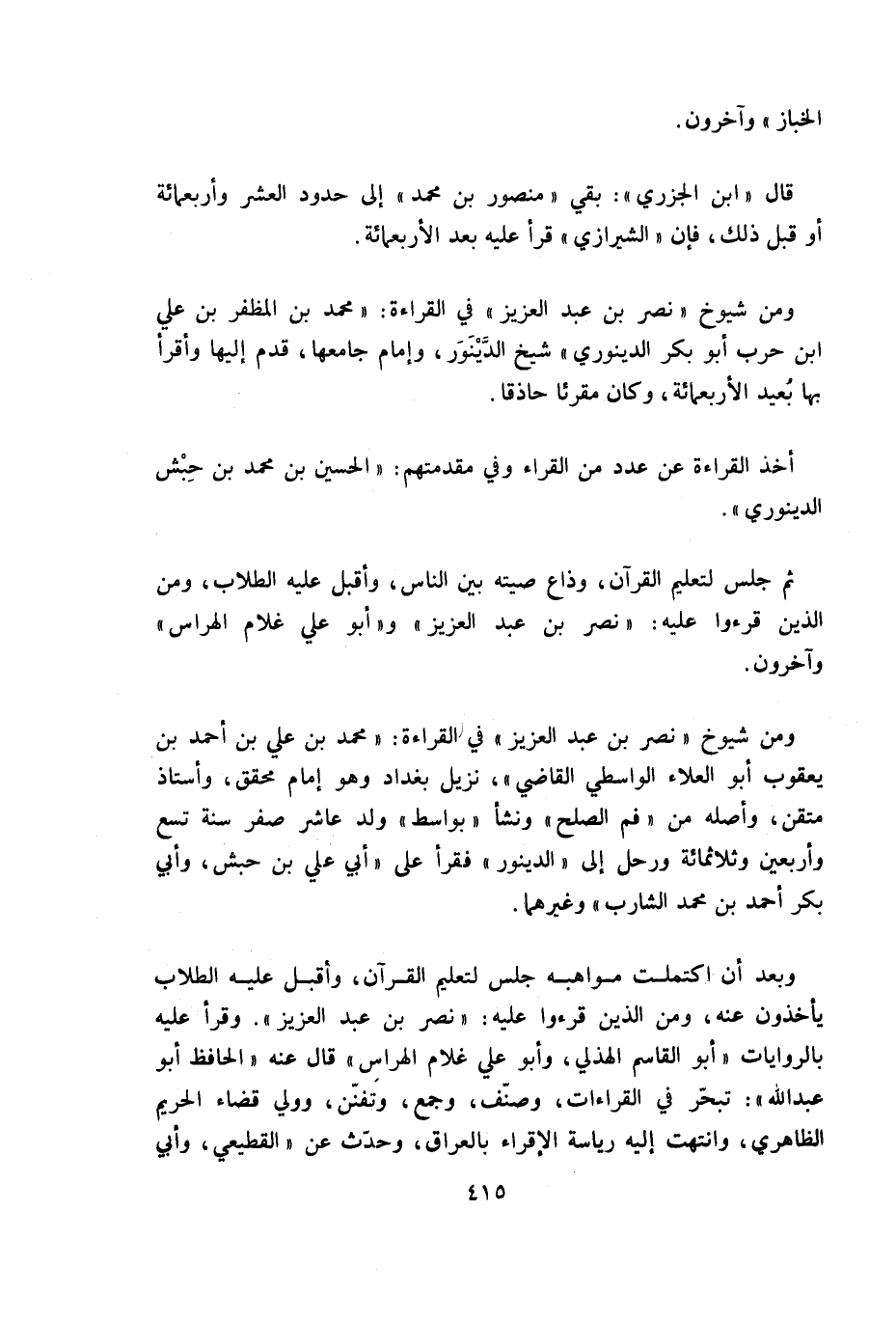 قال «ابن الجزري»: بقي «منصور بن محمد» إلى حدود العشر وأربعمائة أو قبل ذلك، فإن «الشيرازي» قرأ عليه بعد الأربعمائة.