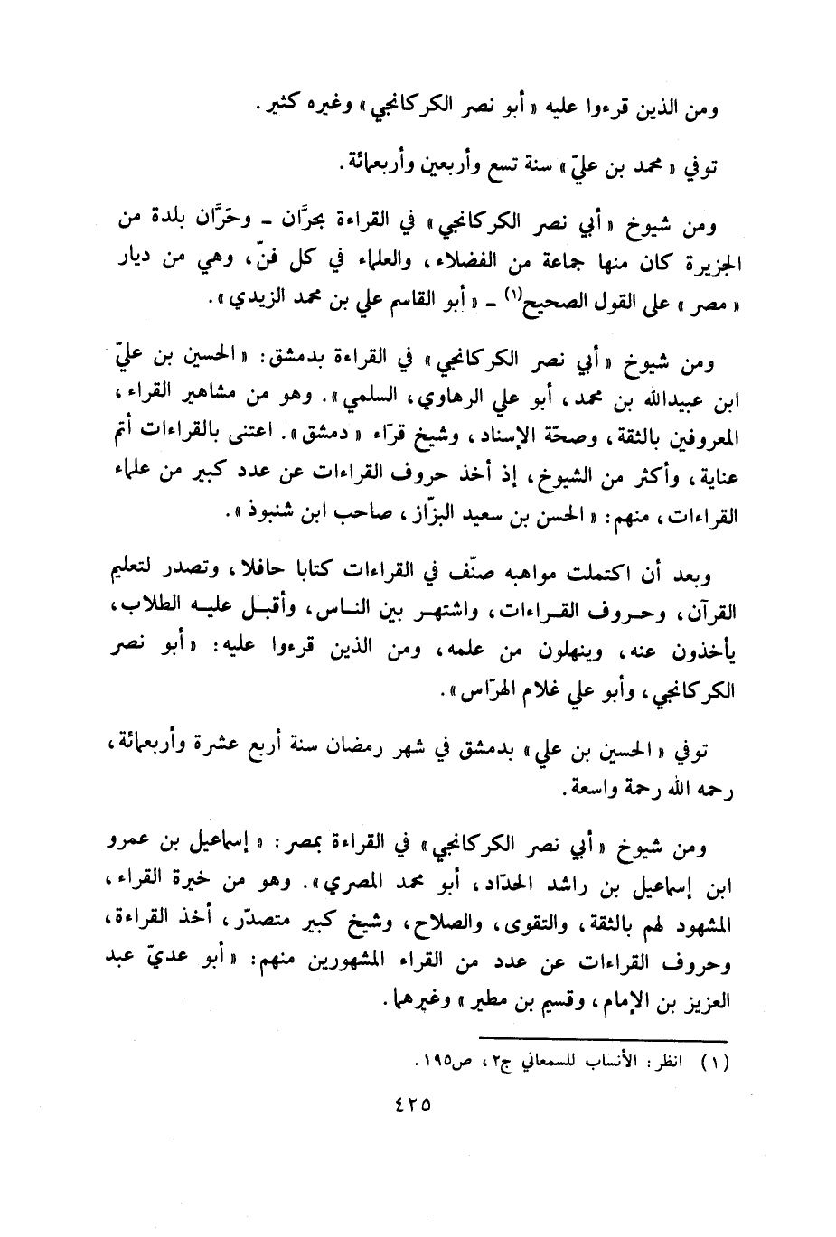 ومن شيوخ «أبي نصر الكركانجي» في القراءة بحرّان- وحرّان بلدة من الجزيرة كان منها جماعة من الفضلاء، والعلماء في كل فنّ، وهي من ديار «مصر» على القول الصحيح (¬1) - «أبو القاسم علي بن محمد الزيدي».
