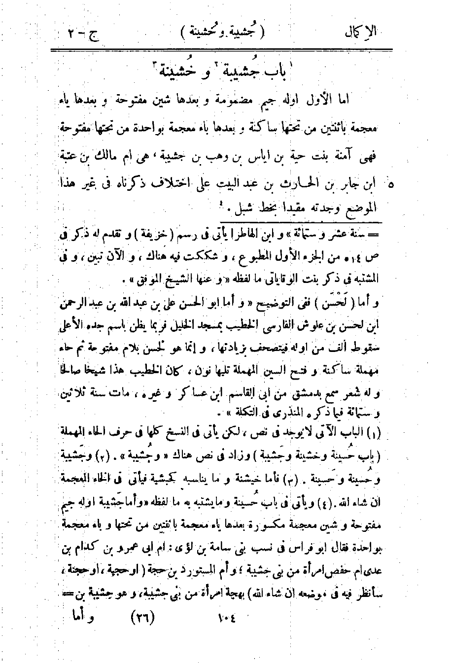 1 الباب الآتي لا يوجد في نص، لكن يأتي في النسخ كلها في حرف الحاء المهملة "باب حسينة وخشينة وجشيبة" وزاد في نص هناك و"جشيبة".