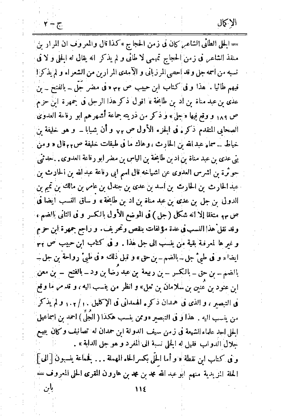 = الجلي الطائي الشاعر كان في زمن الحجاج" كذا قال والمعروف أن المرار بن منقذ الشاعر في زمن الحجاج تميمي لا طائي ولم يذكر أنه يقال له الجلي ولا في نسبه من اسمه جل وقد أحصى المرزباني والآمدي المرارين من الشعراء ولم يذكر فيهم طائيًا. هذا وفي كتاب ابن حبيب ص32 "في مضر جل -بالفتح- بن عدي بن عبد مناة بن أد بن طابخة" أقول ذكر هذا الرجل في جمهرة ابن حزم ص189 ووقع فيها "جلي" وذكر من ذريته جماعة أشهرهم أبو رفاعة العدوي الصحابي المتقدم ذكره في الجزء الأول ص72 وأن شبابا -وهو خليفة بن خياط- سماه عبد الله بن الحارث، وهاك ما في طبقات خليفة ص22 قال: "ومن بني عدي بن عبد مناة بن أد بن طابخة بن إلياس بن مضر أبو رفاعة العدوي.. حدثني حوثرة بن أشرس العدوي عن أشياخه قال اسم أبي رفاعة عبد الله بن الحارث بن عبد الحارث بن الحارث بن أسد بن عدي بن جندل بن عامر بن مالك بن تميم بن الدول بن جل بن عبد مناة بن أد بن طابخة" وساق النسب أيضًا في ص93 متفقًا إلا أنه شكل "جل" في الموضع الأول بالكسر وفي الثاني بالضم، وقد نقل هذا النسب في عدة مؤلفات بنقص وتحريف. وراجع جمهرة ابن حزم وغيرها لمعرفة بقية من ينسب إلى جل هذا. وفي كتاب ابن حبيب ص32 أيضًا "وفي طيئ جل -بالضم- بن حق" وقبل ذلك "في طيئ رواحة بن جل -بالضم- بن حق -بالكسر- بن ربيعة بن عبد رضا بن ود -بالفتح- بن معن بن عتود بن عنين بن سلامان بن ثعل" وانظر من ينسب إليه، وقد مر ما وقع في التبصير، والذي في همدان ذكره الهمداني في الإكليل 10/ 102 ولم يذكر من ينسب إليه. هذا وفي التبصير "وممن ينسب هكذا "الجلي" أحمد بن إسماعيل الجلي أحد علماء الشيعة في زمن سيف الدولة ابن حمدان له تصانيفت وكان يبيع جلال الدواب فقيل له الجلي نسبة إلى المفرد وهو جل الدابة".