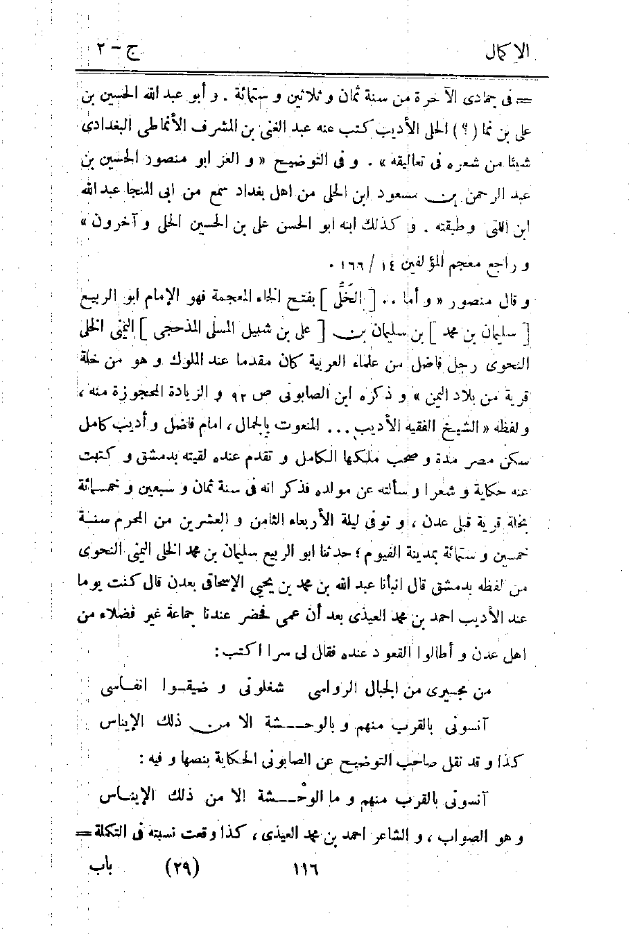 وقال منصور "وأما.. [الخلي] بفتح الخاء" المعجمة فهو الإمام أبو الربيع [سليمان بن محمد] بن سليمان بن [علي بن شبيل المسلي المذحجي] التميمي الخلي النحوي رجل فاضل من علماء العربية كان مقدما عند الملوك وهو من خلة قرية من بلاد اليمن" وذكره ابن الصابوني ص92 والزيادة المحجوزة منه، ولفظه "الشيخ الفقيه الأديب ... المنعوت بالجمال، أمام فاضل وأديب كامل سكن مصر مدة وصحب ملكها الكامل وتقدم عنده لقيته بدمشق وكتبت عنه حكاية وشعرا وسألته عن مولده فذكر أنه في سنة ثمان وسبعين وخمسمائة بخلة قريب قبلي عدن، توفي ليلة الأربعاء الثامن والعشرين من المحرم سنة خمسين وستمائة بمدينة الفيوم؛ حدثنا أبو الربيع سليمان بن محمد الخلي اليمني النحوي من لفظه بدمشق قال أنبأنا عبد الله بن محمد بن يحيى الإسحاقي بعدن قال كنت يوما عند الأديب أحمد بن محمد العيذي بعد أن عمي فحضر عندنا جماعة غير فضلاء من أهل عدن وأطالوا القعود عنده فقال لي سرا اكتب: