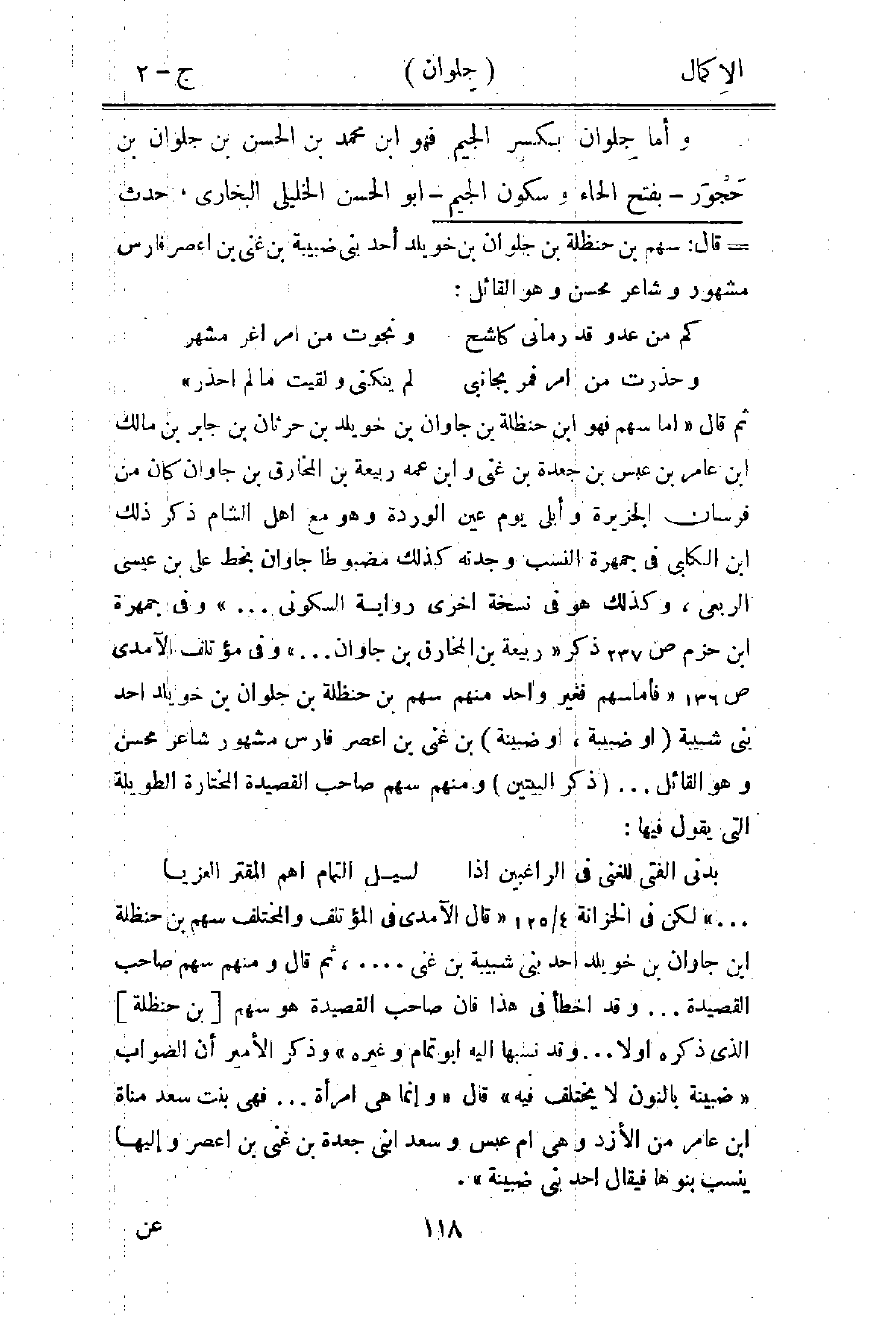 ثم قال: "أما سهم فهو ابن حنظلة بن جاوان بن خويلد بن حرثان بن جابر بن مالك بن عامر بن عبس بن جعدة بن غني وابن عمه ربيعه بن المخارق بن جاوان كان من فرسان الجزيرة وأبلى يوم عين الوردة وهو مع أهل الشام ذكر ذلك بان الكلبي في جمهرة النسب وجدته كذلك مضبوطًا جاوان بخط علي بن عيسى الربعي، وكذلك هو في نسخة أخرى رواية السكوني، وليس في العرب جلوان وإنما هو جاوان في "النسخة: جاوران" ولعل الواو كانت قاربت الألف فظنها الناسخ متصلة فكتب جلوان ... " وفي جمهرة ابن حزم ص237 ذكر "ربيعة بن المخارق بن جاروان" وفي ومؤتلف الآمدي ص136 "فأما سهم فغير واحد منهم سهم بن حنظلة بن جلوان بن خويلد أحد بني شبيبة "أو ضبيبة، أو ضبينه" ابن غني بن أعصر فارس مشهور شاعر محسن وهو القائل. "ذكر البيتين" ومنهم سهم صاحب القصيدة المختارة الطويلة التي يقول فيها: