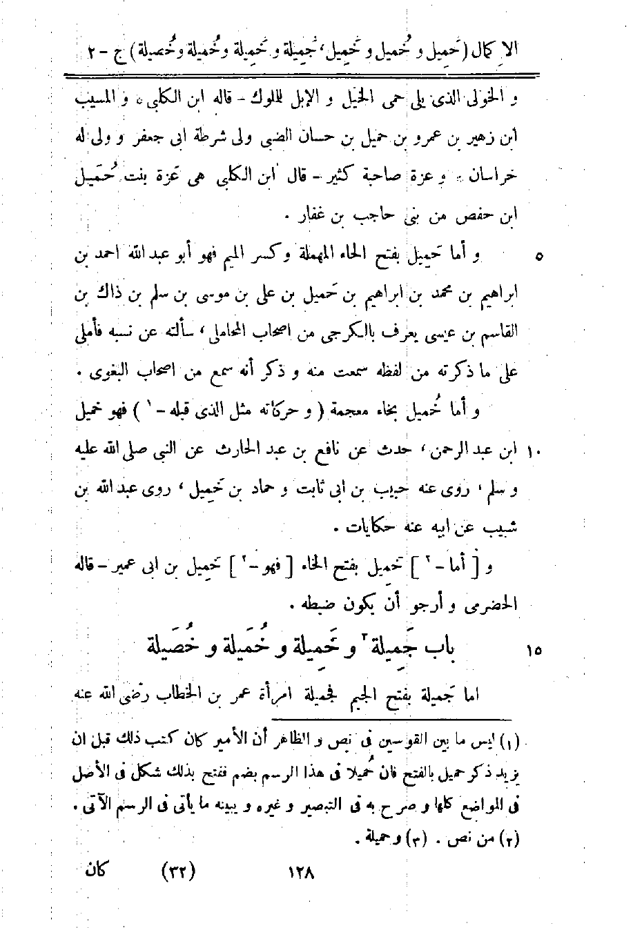 1 ليس ما بين القوسين في نص والظاهر أن الأمير كان كتب ذلك قبل أن يزيد ذكر حميل بالفتح فإن خميلًا في هذا الرسم ففتح بذلك شكل في الأصل في المواضع كلها وصرح به في التبصير وغيره ويبينه ما يأتي في الرسم الآتي.