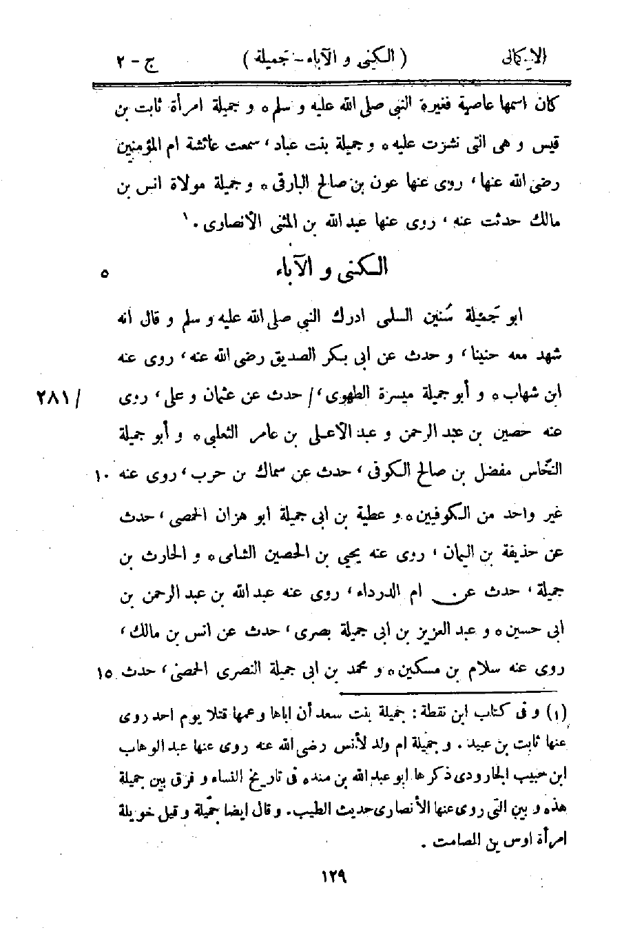 1 وفي كتاب ابن نقطة: جميلة بنت سعد أن أباها وعمها قتلا يوم أحد روى عنها ثابت بن عبيد. وجميلة أم ولد لأنس رضي الله عنه روى عنها عبد الوهاب بن حبيب الجارودي ذكرها أبو عبد الله بن منده في تاريخ النساء وفرق بين جميلة هذه وبين التي روى عنها الأنصاري حديث الطيب. وقال أيضًا جميلة وقيل خويلة امرأة أوس بن الصامت.