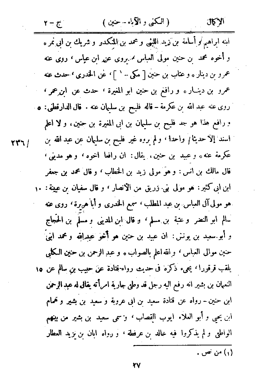 ابنه إبراهيم وأسامة بن زيد الليثي ومحمد بن المنكدر وشريك بن أبي نمرة وأخوه محمد بن حنين مولى العباس سيروي عن ابن عباس، روى عنه عمرو بن دينار، وعتاب بن حنين [مكي1] ، عن الخدري، حدث عنه عمرو بن دينار، ورافع بن حنين أبو المغيرة، حدث عن ابن عمر، روى عنه عبد الله بن عكرمة، قاله فليح بن سليمان عنه. قال الدارقطني: ورافع هذا هو جد فليح بن سليمان بن أبي المغيرة بن حنين، ولا أعلم أسند إلا حديثًا واحدًا، ولم يروه غير فليح بن سليمان عن عبد الله بن عكرمة عنه، وعبيد بن حنين، يقال: إن رافعًا أخوه، وهو مديني، قال مالك بن أنس: وهو مولى زيد بن الخطاب، وقال محمد بن جعفر بن أبي كثير: هو مولى بني زريق من الأنصار، وقال سفيان بن عيينة: هو مولى آل العباس بن عبد المطلب، سمع الخدري وأبا هريرة، روى عنه سالم أبو النضر وعتبة بن مسلم، وقال ابن المديني ومسلم بن الحجاج وأبو سعيد بن يونس: إن عبيد بن حنين هو أخو عبد الله ومحمد ابني حنين موالي العباس، والله أعلم بالصواب، وعبد الرحمن بن حنين الكلبي يلقب قرقورا، يجيء ذكره في حديث رواه قتادة عن حبيب بن سالم عن النعمان بن بشير أنه رفع إليه رجل قد وطئ جارية امرأته يقال له عبد الرحمن ابن حنين، رواه عن قتادة سعيد بن أبي عروبة وسعيد بن بشير وهمام بن يحيى وأبو العلاء أيوب القصاب، وسمي سعيد بن بشير من بينهم الواطئ ولم يذكروا فيه خالد بن عرفطة، ورواه أبان بن يزيد العطار