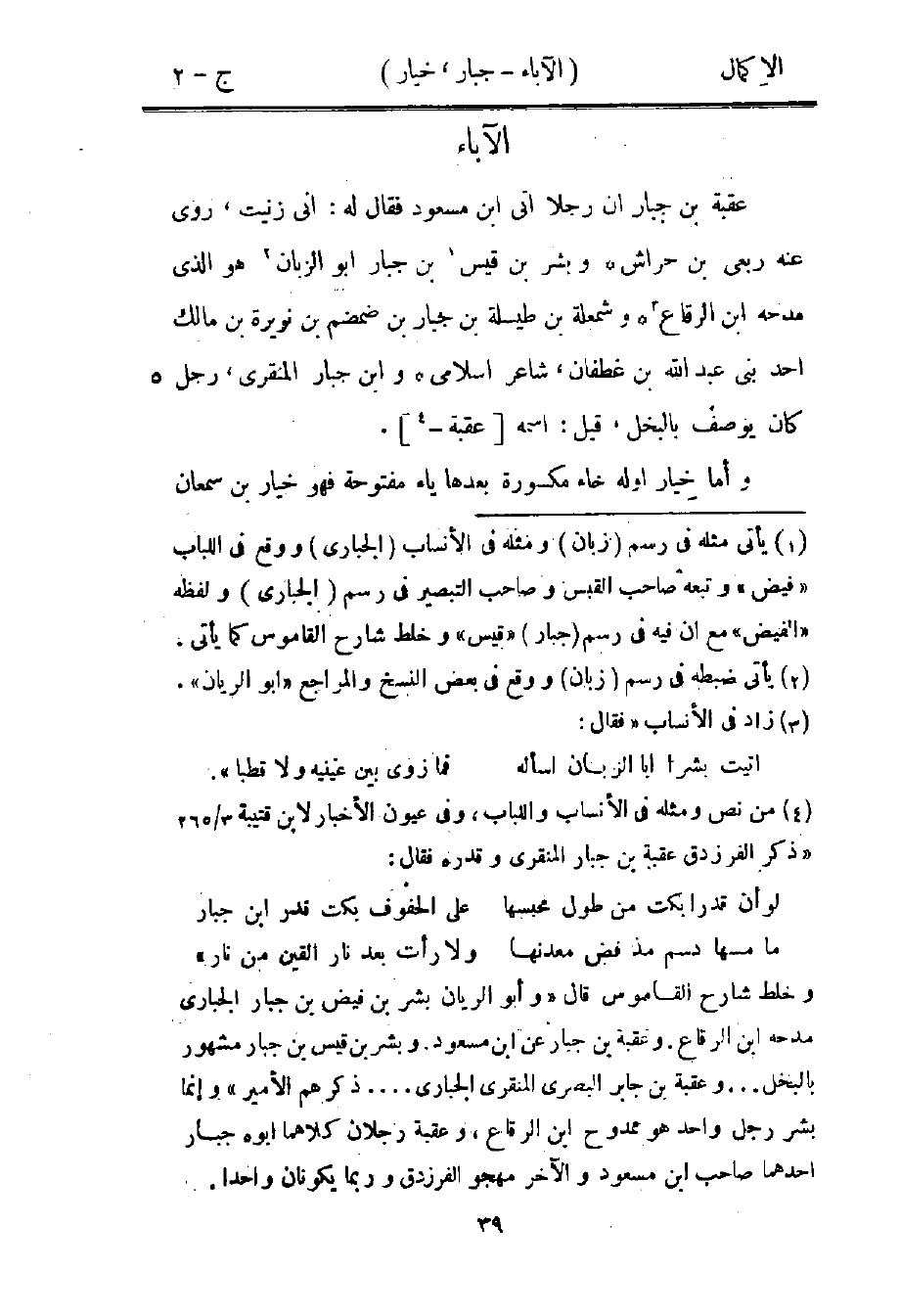 1 يأتي مثله في رسم "زبان" ومثله في الأنساب "الجباري" ووقع في اللباب "فيض" وتبعه صاحب القبس وصاحب التبصير في رسم "الجباري" ولفظه "الفيض" مع أن فيه رسم "جبار" "قيس" وخلط شارح القاموس كما يأتي.