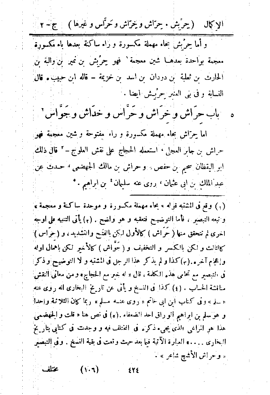 4 في نص هنا "قلت والجهضمي هذا هو المراغي الذي يجيء ذكره في المختلف فيه ووجدت في كتابي بتاريخ البخاري ... " العبارة الآتية فيما بعد حيث وقعت في بقية النسخ. وفي التبصير "وحراش الأشج شاعر".