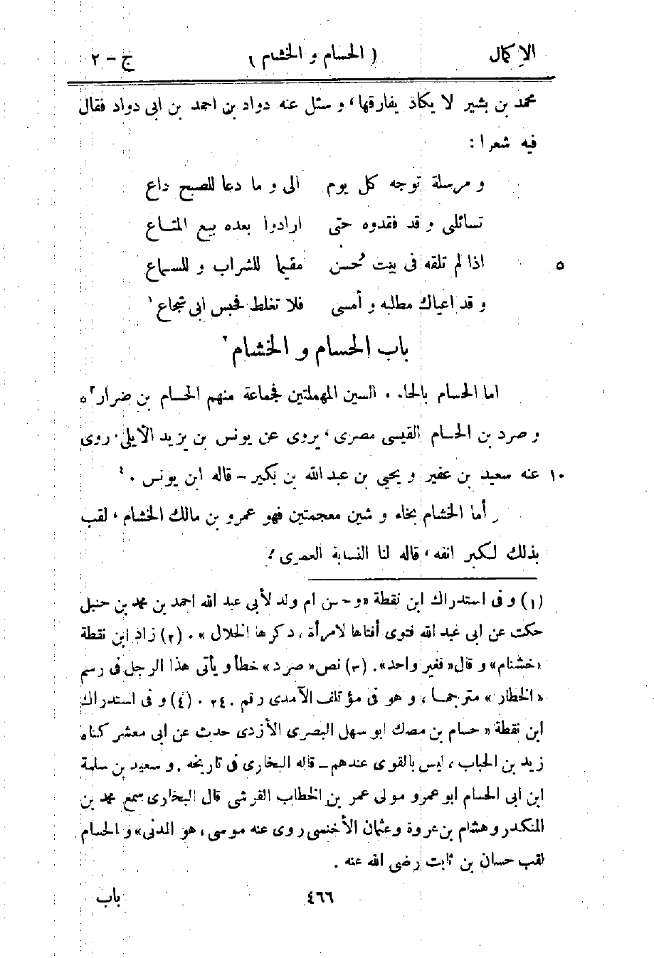 3 وفي استدراك ابن نقطة "حسام بن مصك أبو سهل البصري الأزدي حدث عن أبي معشر كناه زيد بن الحباب، وليس بالقوي عندهم، قاله البخاري في تاريخه. وسعيد بن سلمة بن أبي الحسام أبو عمرو مولى آل عمر بن الخطاب القرشي قال البخاري سمع محمد بن المنكدر وهشام بن عروة وعثمان الأخنسي روى عنه موسى، وهو المدني" والحسام لقب حسان بن ثابت رضي الله عنه.
