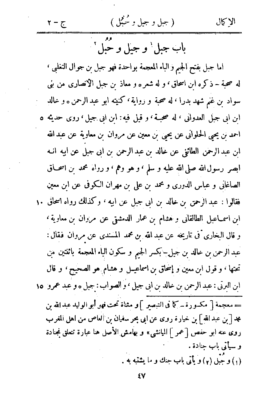 أما جبل بفتح الجيم والباء المعجمة بواحدة فهو جبل بن جوال التغلبي، له صحبة، ذكره ابن إسحاق، وله شعر، ومعاذ بن جبل الأنصاري من بني سواد بن غنم شهد بدرًا، له صحبة ورواية، كنيته أبو عبد الرحمن، وخالد بن أبي جبل العدواني، له صحبة، وقيل فيه: ابن أبي جيل، روى حديثه أحمد بن يحيى الحلواني عن يحيى بن معين عن مروان بن معاوية عن عبد الله بن عبد الرحمن الطائفي عن خالد بن عبد الرحمن بن أبي جبل عن أبيه أبي هريرة أبصر رسول الله صلى الله عليه وسلم، وهو وهم، ورواه محمد بن إسحاق الصاغاني وعباس الدوري ومحمد بن علي بن مهران الكوفي عن ابن معين فقالوا: عبد الرحمن بن خالد بن أبي جبل عن أبيه، وكذلك رواه إسحاق بن إسماعيل الطالقاني وهشام بن عمار الدمشقي عن مروان بن معاوية، وقال البخاري في تاريخه عن عبد الله بن محمد المسندي عن مروان فقال: عبد الرحمن بن خالد بن جيل -كسر الجيم وسكون الياء المعجمة باثنتين من تحتها- قول ابن معين وإسحاق بن إسماعيل وهشام هو الصحيح، وقال ابن البرقي: عبد الرحمن بن خالد بن أبي جيل، والصواب: جبل، وعبد عمرو