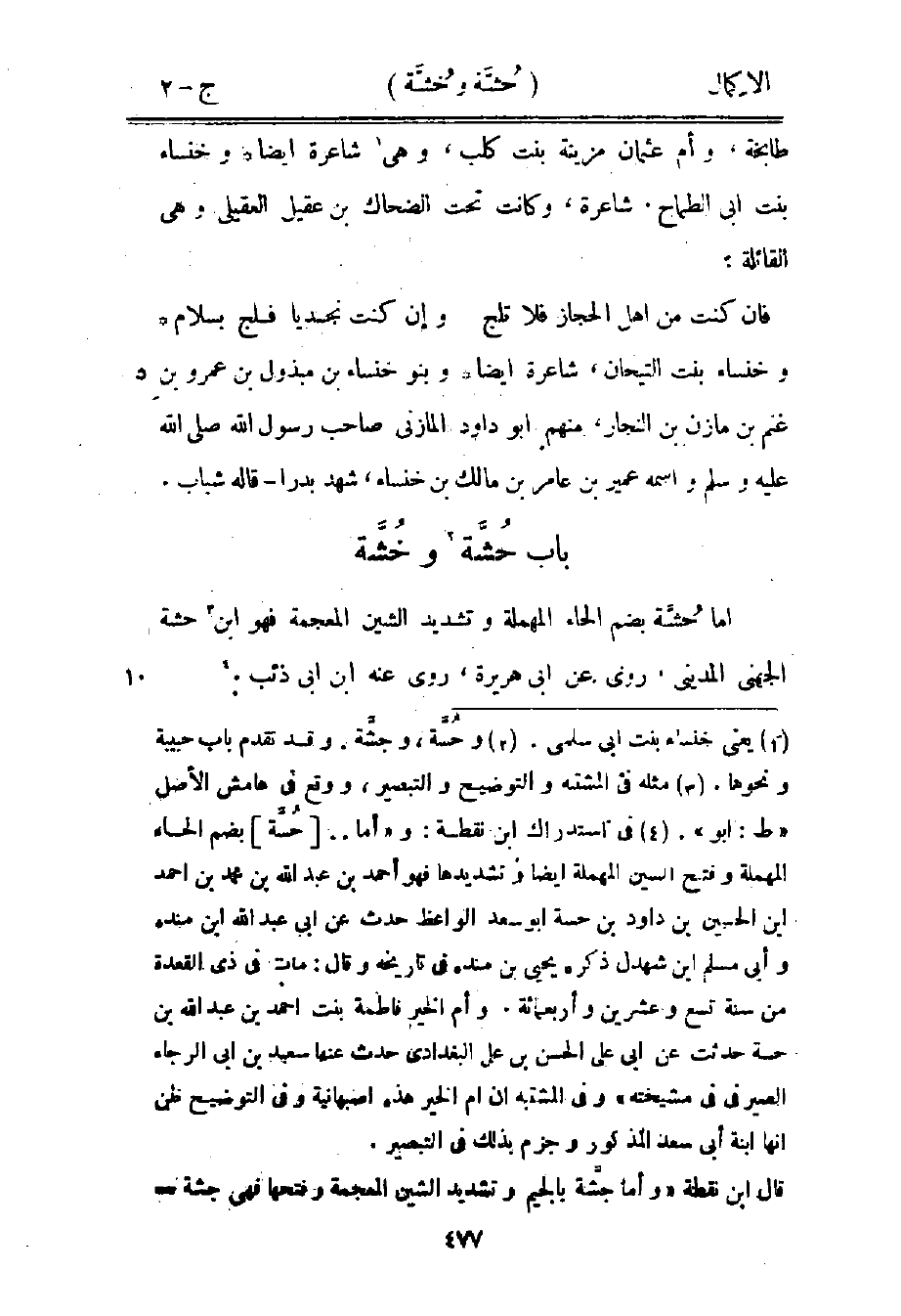 3 في استدراك ابن نقطة: و"أما ... [حُسَّة] بضم الحاء المهملة وفتح السين المهملة أيضا وتشديدها فهو أحمد بن عبد الله بن محمد بن أحمد بن الحسين بن داود بن حسة أبو سعد الواعظ حدث عن أبي عبد الله بن منده وأبي مسلم بن شهدل ذكره يحيى بن منده في تاريخه وقال: مات في ذي القعدة من سنة تسع وعشرين وأربعمائة. وأم الخير فاطمة بنت أحمد بن عبد الله بن حسة حدثت عن أبي علي الحسن بن علي البغدادي حدث عنها سعيد بن أبي الرجاء الصيرفي مشيخته" وفي المشتبه أن أم الخير هذه أصبهانية وفي التوضيح ظن أنها ابنة أبي سعد المذكور وجزم بذلك في التبصير.