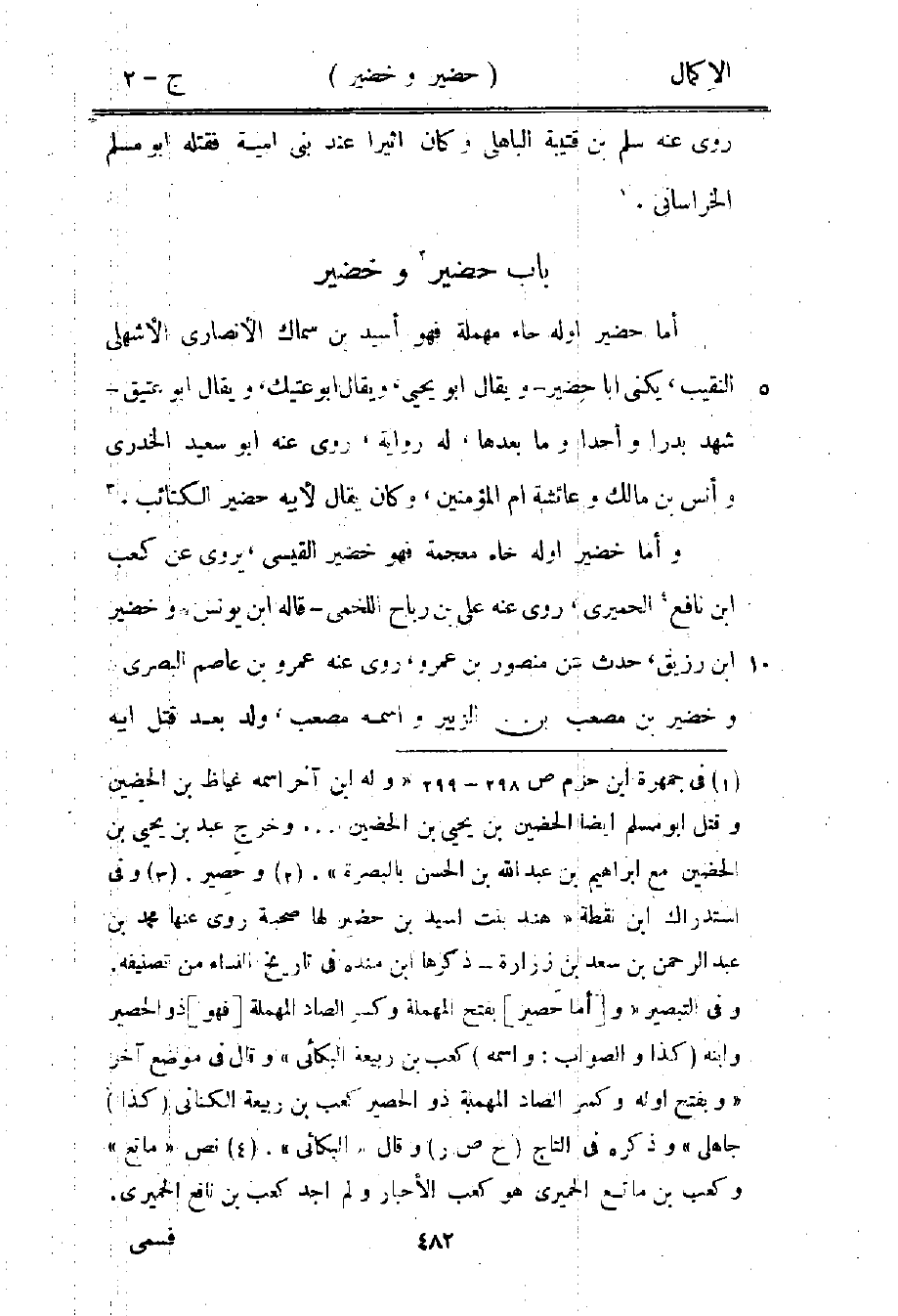 وأما خضير أوله خاء معجمة فهو خضير القيسي، يروي عن كعب بن نافع3 الحميري، روى عنه علي بن رباح اللخمي، قاله ابن يونس، وخضير بن رزيق، حدث عن منصور بن عمرو، روى عنه عمرو بن عاصم البصري، وخضير بن مصعب بن الزبير واسمه مصعب، ولد بعد قتل أبيه