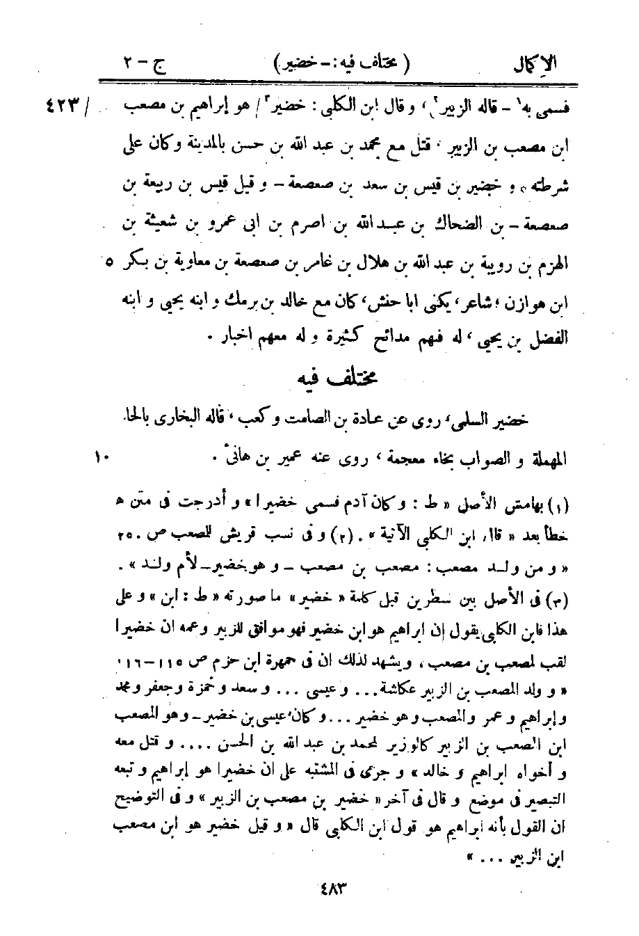 3 في الأصل بين سطرين قبل كلمة "خضير" ما صورته "ط: ابن" وعلى هذا فابن الكلبي يقول إن إبراهيم هو ابن خضير فهو موافق للزبير وعمه أن خضيرا لقب لمصعب بن مصعب، ويشهد لذلك أن في جمهرة ابن حزم ص115-116. "وولد المصعب بن الزبير عكاشة ... وعيسى ... وسعد وحمزة وجعفر ومحمد وإبراهيم وعمر والمصعب وهو خضير ... وكان عيسى بن خضير، وهو المصعب بن المصعب بن الزبير كالوزير لمحمد بن عبد الله بن الحسن ... وقتل معه وأخواه إبراهيم وخالد" وجرى في المشتبه على أن خضيرا هو إبراهيم وتبعه التبصير في موضع وقال في آخر "خضير بن مصعب بن الزبير" وفي التوضيح أن القول بأنه إبراهيم هو قول ابن الكلبي قال: "وقيل خضير هو ابن مصعب بن الزبير ... ".