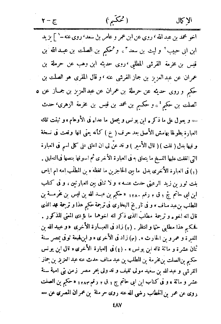 1 في العبارة الأخرى بدل ما بين الحاجزين ما لفظه "بن المطلب أمه أم إياس بنت ثور بن زيد زيد الرعيني حدث عنه" ولا تنافي بين العبارتين، وفي كتاب ابن أبي حاتم ج1 ق2 رقم 1280 "حكيم بن عبد الله بن قيس بن مخرمة بن المطلب بن عبد مناف" وفي تاريخ البخاري في ترجمة حكيم هذا وترجمة محمد الذي قال إنه أخوه وترجمة مطلب الذي ذكر أنه أخوهما ما يؤدي المعنى المذكور.