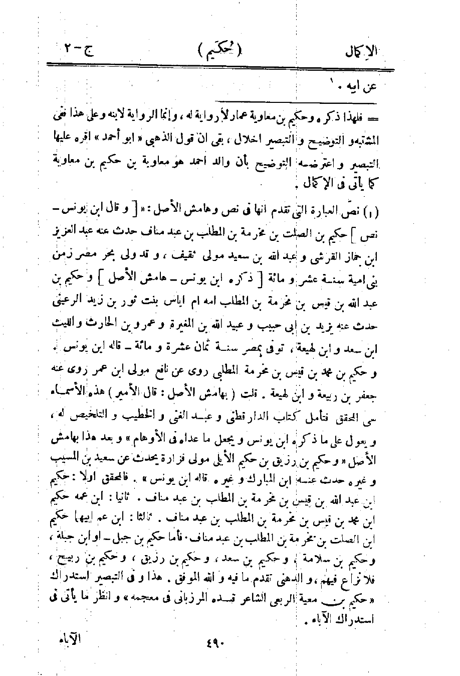 وحكيم بن محمد بن قيس بن مخرمة المطلبي روى عن نافع مولى ابن عمر روى عنه جعفر بن ربيعة وابن لهيعة. قلت "بهامش الأصل: قال الأمير" هذه الأسماء هي المحقق فتأمل كتاب الدارقطني وعبد الغني والخطيب والتلخيص له، ويعول على ما ذكره ابن يونس ويجعل ما عداه في الأوهام" وبعد هذا بهامش الأصل "وحكيم بن رزيق بن حكيم الأيلي مولى فزارة يحدث عن سعيد بن المسيب وغيره حدث عنه ابن المبارك وغيره قال ابن يونس". فالمحقق أولا: حكيم بن عبد الله بن قيس بن مخرمة بن المطلب بن عبد مناف.