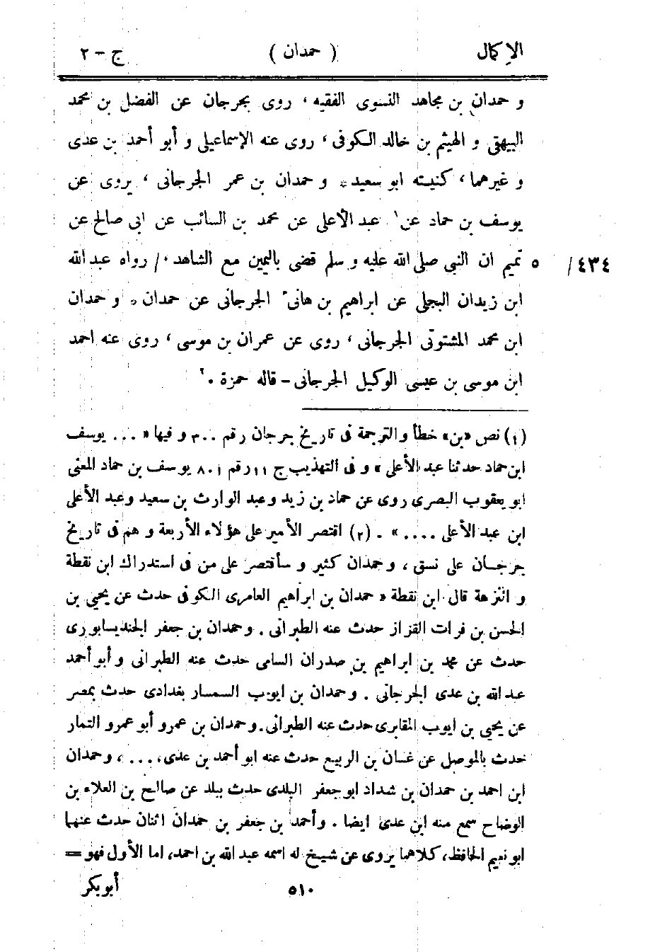 2 اقتصر الأمير على هؤلاء الأربعة وهم في تاريخ جرجان على نسق، وحمدان كثير وسأقتصر على من في استدراك ابن نقطة والنزهة قال ابن نقطة "حمدان بن إبراهيم العامري الكوفي حدث عن يحيى بن الحسن بن فرات القزاز حدث عنه الطبراني. وحمدان بن جعفر الجنديسابوري حدث عن محمد بن إبراهيم بن صدران السامي حدث عنه الطبراني وأبو أحمد عبد الله بن عدي الجرجاني. وحمدان بن أيوب السمسار بغدادي حدث بمصر عن يحيى بن أيوب المقابري حدث عنه الطبراني. وحمدان بن عمرو أبو عمرو التمار حدث بالموصل عن غسان بن الربيع حدث عنه أبو أحمد بن عدي ... وحمدان بن أحمد بن حمدان بن شداد أبو جعفر البلدي حدث ببلد عن صالح بن العلاء بن الوضاح سمع منه ابن عدي أيضًا. وأحمد بن جعفر بن حمدان اثنان حدث عنهما أبو نعيم الحافظ، كلاهما يروي عن شيخ له اسمه عبد الله بن أحمد، أما الأول فهو =