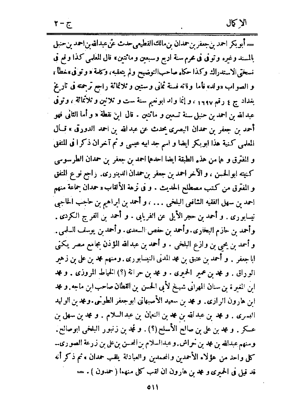 = أبو بكر أحمد بن جعفر بن حمدان بن مالك القطيعي حدث عن عبد الله بن أحمد بن حنبل بالمسند وغيره، وتوفي في محرم سنة أربع وسبعين ومائتين" قال المعلمي كذا وقع في نسختي الاستدراك وكذا حكاه صاحب التوضيح ولم يتعقبه، وكلمة "وتوفي" خطأ، والصواب "ولد" فأما وفاته فسنة ثماني وستين وثلاثمائة راجع ترجمته في تاريخ بغداد ج4 رقم 1697، وإنما ولد أبو نعيم سنة ست وثلاثين وثلاثمائة، وتوفي عبد الله بن أحمد بن حنبل سنة تسعين ومائتين. قال ابن نقطة "وأما الثاني فهو أحمد بن جعفر بن حمدان البصري يحدث عنه عبد الله بن أحمد الدورقي" قال المعلمي كنية هذا أبو بكر أيضا واسم جد أبيه عيسى وثم آخران ذكرا في المتفق والمفترق وهما من هذه الطبقة أيضًا أحدهما أحمد بن جعفر بن حمدان الطرسوسي كنيته أبو الحسن، والآخر أحمد بن جعفر بن حمدان الدينوري. راجع نوع المتفق والمفترق من كتب مصطلح الحديث. وفي نزهة الألقاب "حمدان جماعة منهم أحمد بن سهل الفقيه الشافعي البلخي ... وأحمد بن إبراهيم بن حاجب الحاجبي نيسابوري. وأحمد بن حجر الأيلي عن الفريابي. وأحمد بن الفرج الكردي. وأحمد بن حازم البخاري. وأحمد بن حفص السعدي. وأحمد بن يوسف السلمي. وأحمد بن يحيى بن وازع البلخي. وأحمد بن عبد الله المؤذن بجامع مصر يكنى أبا جعفر. وأحمد بن عتيق بن محمد المدني النيسابوري. ومنهم محمد بن علي بن زهير الوراق. ومحمد بن عمير الحميري. ومحمد بن حرانة "؟ " الخياط المروزي. ومحمد بن المغيرة بن سنان المهراني شيخ لأبي الحسن بن القطان صاحب ابن ماجه. ومحمد بن هارون الرازي. ومحمد بن سعيد الأصبهاني أبو جعفر الطوخي. ومحمد بن الوليد البسري. ومحمد بن عبد الله بن محمد بن النعمان بن عبد السلام. ومحمد بن سهل بن عسكر. ومحمد بن علي بن صالح الأسلح"؟ ". ومحمد بن زنبور البلخي أبو صالح.