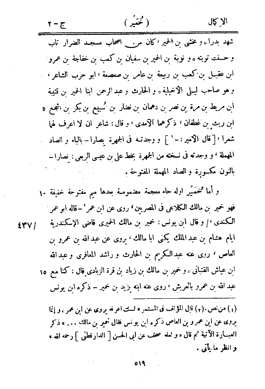 وأما خمير أوله حاء معجمة مضمومة بعدها ميم مفتوحة خفيفة فهو خمير بن مالك الكلاعي في المصريين، روى عن ابن عمر2، قاله أبو عمر الكندي، وقال ابن يونس: خمير بن مالك الحميري قاضي الإسكندرية أيام هشام بن عبد الملك يكنى أبا مالك، يروي عن عبد الله بن عمرو بن العاص، روى عنه عبد الكريم بن الحارث وراشد المعافري وعبد الله بن عياش القتباني، وخمير بن مالك بن زياد بن قرة الزبادي قال: كنا مع عبد الله بن عمرو بالعريش، روى عنه ابنه يزيد بن خمير، ذكره ابن يونس
