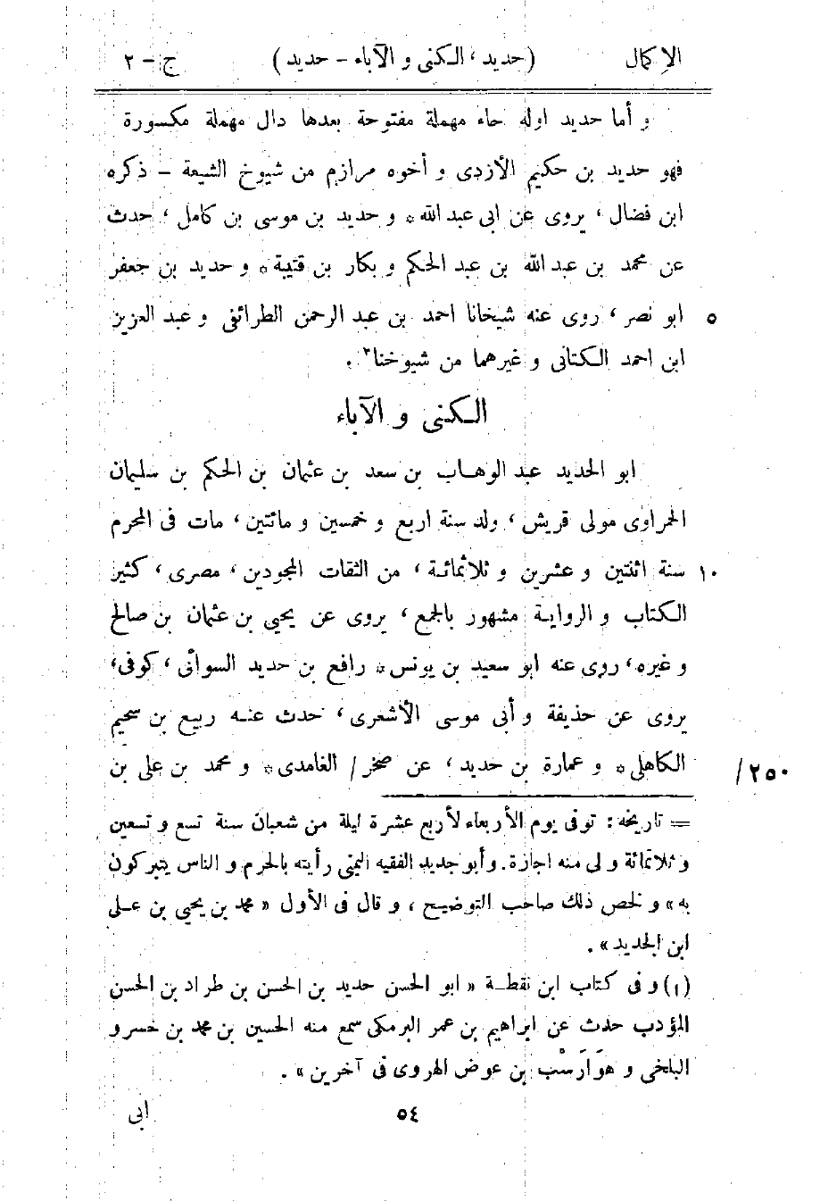 وأما حديد أوله حاء مهملة مفتوحة بعدها دال مهملة مكسورة فهو حديد بن حكيم الأزدي وأخوه مرازم من شيوخ الشيعة، ذكره ابن فضال، يروي عن أبي عبد الله، وحديد بن موسى بن كامل، حدث عن محمد بن عبد الله بن عبد الحكم وبكار بن قتيبة، وحديد بن جعفر أبو نصر، روى عنه شيخانا أحمد بن عبد الرحمن الطرائفي وعبد العزيز بن أحمد الكتاني وغيرهما من شيوخنا1.