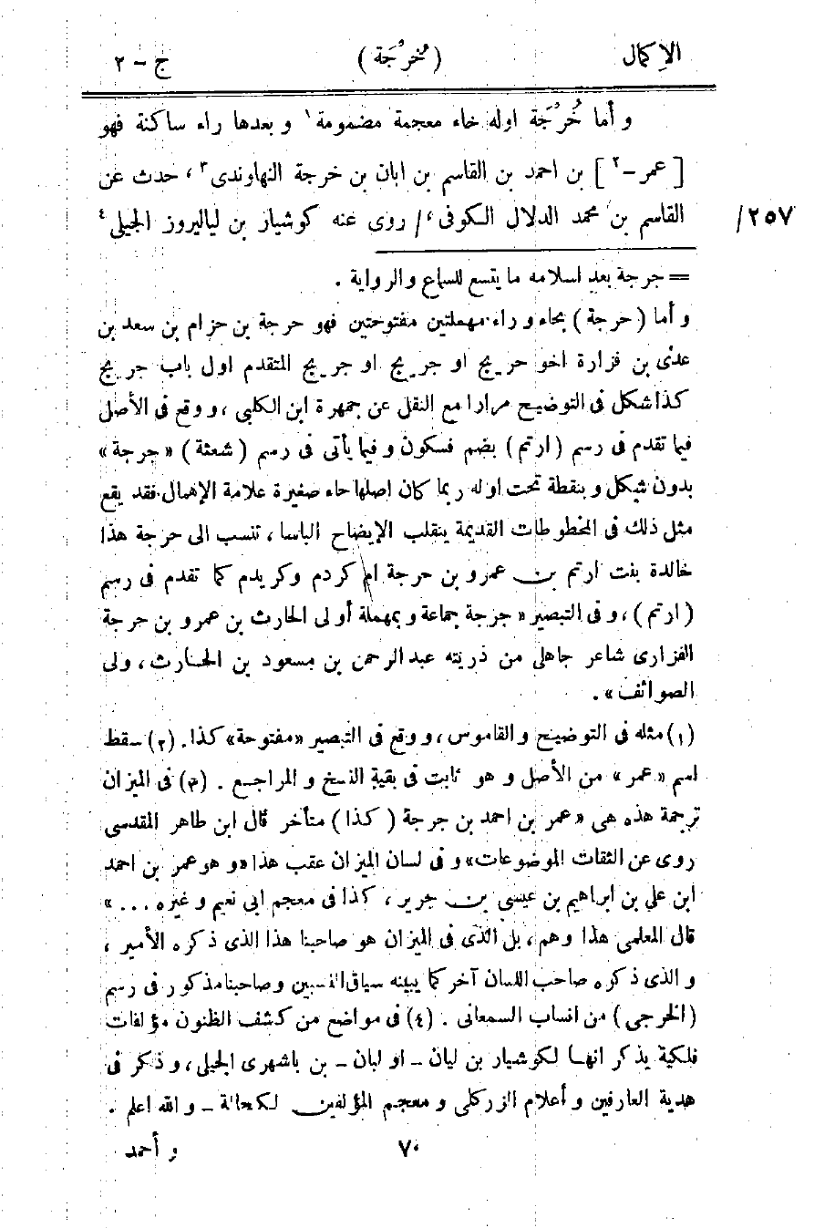 3 في الميزان ترجمة هذه هي "عمر بن أحمد بن جرجة "كذا" متأخر قال ابن طاهر المقدسي روى عن الثقات الموضوعات" وفي لسان الميزان عقب هذا "وهو عمر بن أحمد بن علي بن أبي إبراهيم بن عيسى جرير، كذا في معجم أبي نعيم وغيره ... " قال المعلمي هذا وهم، بل الذي في الميزان هو صاحبنا هذا الذي ذكره الأمير، والذي ذكره صاحب اللسان آخر كما يبينه سياق النسبين وصاحبنا مذكور في رسم "الخرجي" من أنساب السمعاني.
