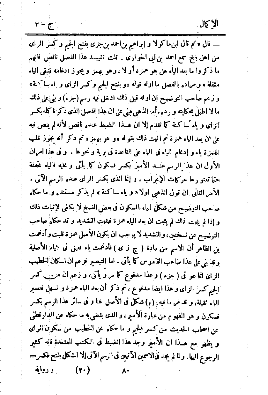 = قال: "ثم قال ابن ماكولا وإبراهيم بن أحمد بن جزي بفتح الجيم وكسر الزاي من أهل بلخ سمع أحمد بن أبي الحواري. قلت تقييد هذا الفصل ناقص فإنهم ما ذكروا ما بعد الياء هل هو همزة أولًا، وهو بهمز ويجوز إدغامه فتبقى الياء مثقلة" ومراده بالفصل ما أوله قوله "وبفتح الجيم وكسر الزاي وياء ساكنة" وزعم صاحب التوضيح أن أوله قيل ذلك أدخل فيه رسم "جزء" وبنى على ذلك ما لا أطيل بحكايته ورده. أما الذهبي فبنى على أن هذا الفصل الذي ذكرنا كله بكسر الزاي وياء ساكنة كما تقدم إلا أن هذا الضبط عنده ناقص لأنه لم ينص فيه على أن بعد الياء همزة ثم أثبت ذلك بقوله "وهو بهمز" ثم ذكر أنه يجوز قلب الهمزة ياء وإدغام الياء في الياء على القاعدة في برية ونحوها. وفي هذا أمران الأول أن هذا الرسم عند الأمير بكسر فسكون كما يأتي وعليه فالياء مخففة حتما تعتورها حركات الإعراب، وإنما الذي بكسر الزاي عنده الرسم الآتي.