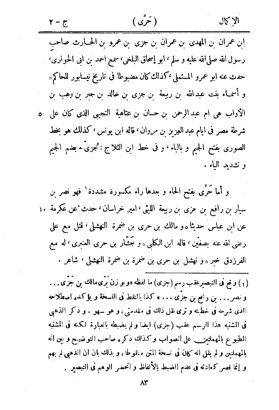 1 وقع في التبصير عقب رسم "جزي" ما لفظه" وبوزن بري مالك بن جزي" ونصر.. بن رافع بن جزي ... " كذا بالنقط في النسخة ويؤكده اصطلاحه الذي شرحه في خطبته وترى نقل ذلك في مقدمتي، وهو سهو، وذكر الذهبي في المشتبه هذا الرسم عقب "جزي" أيضًا ولم يضبطه بالعبارة لكنه في المشتبه المطبوع بالمهملتين على الصواب وكذلك ذكره صاحب التوضيح وبين أنه بالمهملتين ولم يقل إنه كانت في نسخة المتن منقوطًا، وبذلك بأن أن الذهبي لم يهم وإنما قصر كعادته في عدم الضبط بالألفاظ وانحصر الوهم في التبصير.