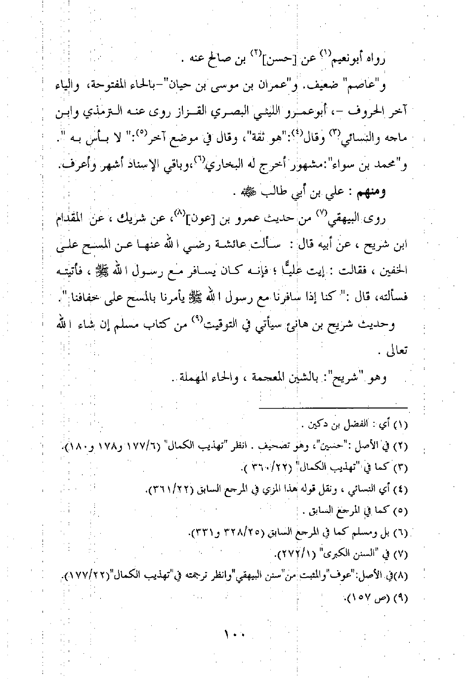 روى البيهقي من حديث عمرو بن [عون]، عن شريك، عن المقدام بن شريح، عن أبيه قال: سألت عائشة رضي الله عنها عن المسح على الخفين، فقالت: إيت عليا، فإنه كان يسافر مع رسول الله صلى الله عليه وسلم فأتيته فسألته، قال: "كنا إذا سافرنا مع رسول الله صلى الله عليه وسلم يأمرنا بالمسح على خفافنا".