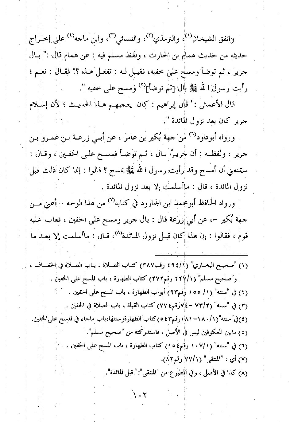 ورواه الحافظ أبو محمد بن الجارود في كتابه من هذا الوجه – أعني من جهة بكير –، عن أبي زرعة قال: بال جرير ومسح على الخفين، فعاب عليه قوم، فقالوا: إن هذا كان قبل نزول المائدة، قال: ما أسلمت إلا بعد ما