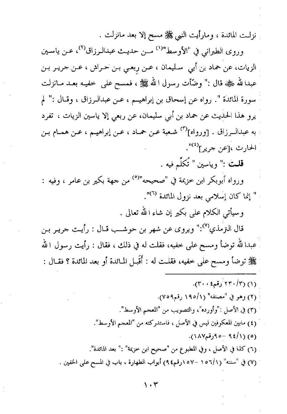 وروى الطبراني في "الأوسط" من حديث عبد الرزاق، عن ياسين الزيات، عن حماد بن أبي سليمان، عن ربعي بن حراش، عن جرير بن عبد الله رضي الله عنه قال: "وضأت رسول الله صلى الله عليه وسلم، فمسح على خفيه بعد ما نزلت سورة المائدة". رواه عن إسحاق بن إبراهيم، عن عبد الرزاق، وقال: "لم يرو هذا الحديث عن حماد بن أبي سليمان، عن ربعي إلا ياسين الزيات، تفرد به عبد الرزاق. [ورواه] شعبة عن حماد، عن إبراهيم، عن همام بن الحارث، [عن جرير] ".