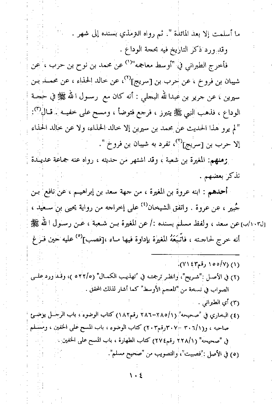 فأخرج الطبراني في "أوسط معاجمة" عن محمد بن نوح بن حرب، عن شيبان بن فروخ، عن حرب بن [سريج]، عن خالد الحذاء، عن محمد بن سيرين، عن جرير بن عبد الله البجلي: أنه كان مع رسول الله صلى الله عليه وسلم في حجة الوداع، فذهب النبي صلى الله عليه وسلم يتبرز، فرجع فتوضأ، ومسح على خفيه. قال: "لم يرو هذا الحديث عن محمد بن سيرين إلا خالد الحذاء، ولا عن خالد الحذاء إلا حرب بن [سريج]، تفرد به شيبان بن فروخ".