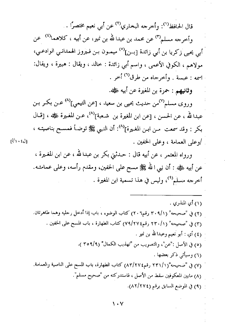 ورواه المعتمر، عن أبيه قال: حدثني بكر بن عبد الله، عن ابن المغيرة، عن أبيه رضي الله عنه: أن نبي الله صلى الله عليه وسلم مسح على الخفين، ومقدم رأسه، وعلى عمامته.