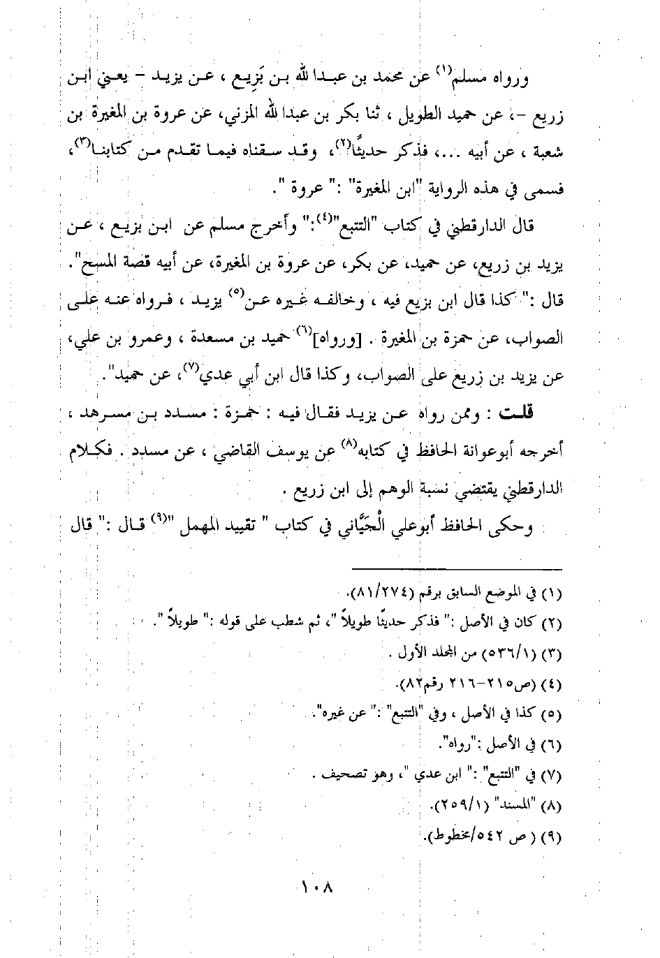 قال الدارقطني في كتاب "التتبع": "وأخرج مسلم عن ابن بزيع، عن يزيد بن زريع، عن حميد، عن بكر، عن عروة بن المغيرة، عن أبيه قصة المسح".