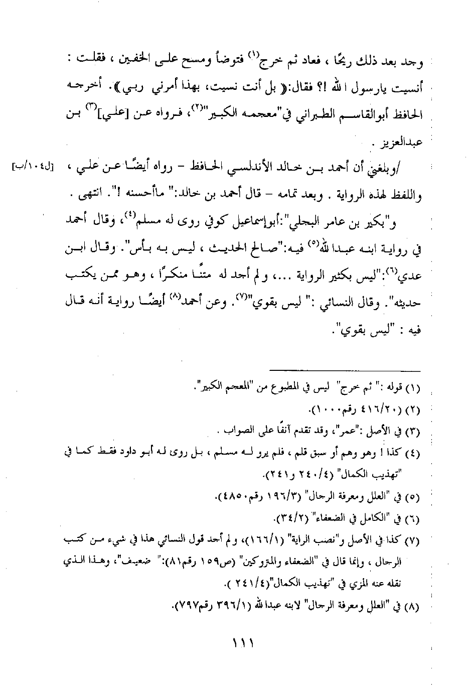 و"بكير بن عامر البجلي": أبو إسماعيل كوفي روى له مسلم، وقال أحمد في رواية ابنه عبد الله فيه: "صالح الحديث، ليس به بأس". وقال ابن عدي: "ليس بكثير الرواية .... ، ولم أجد له متنا منكرا، وهو ممن يكتب حديثه". وقال النسائي: "ليس بقوي". وعن أحمد أيضا رواية أنه قال فيه: "ليس بقوي".