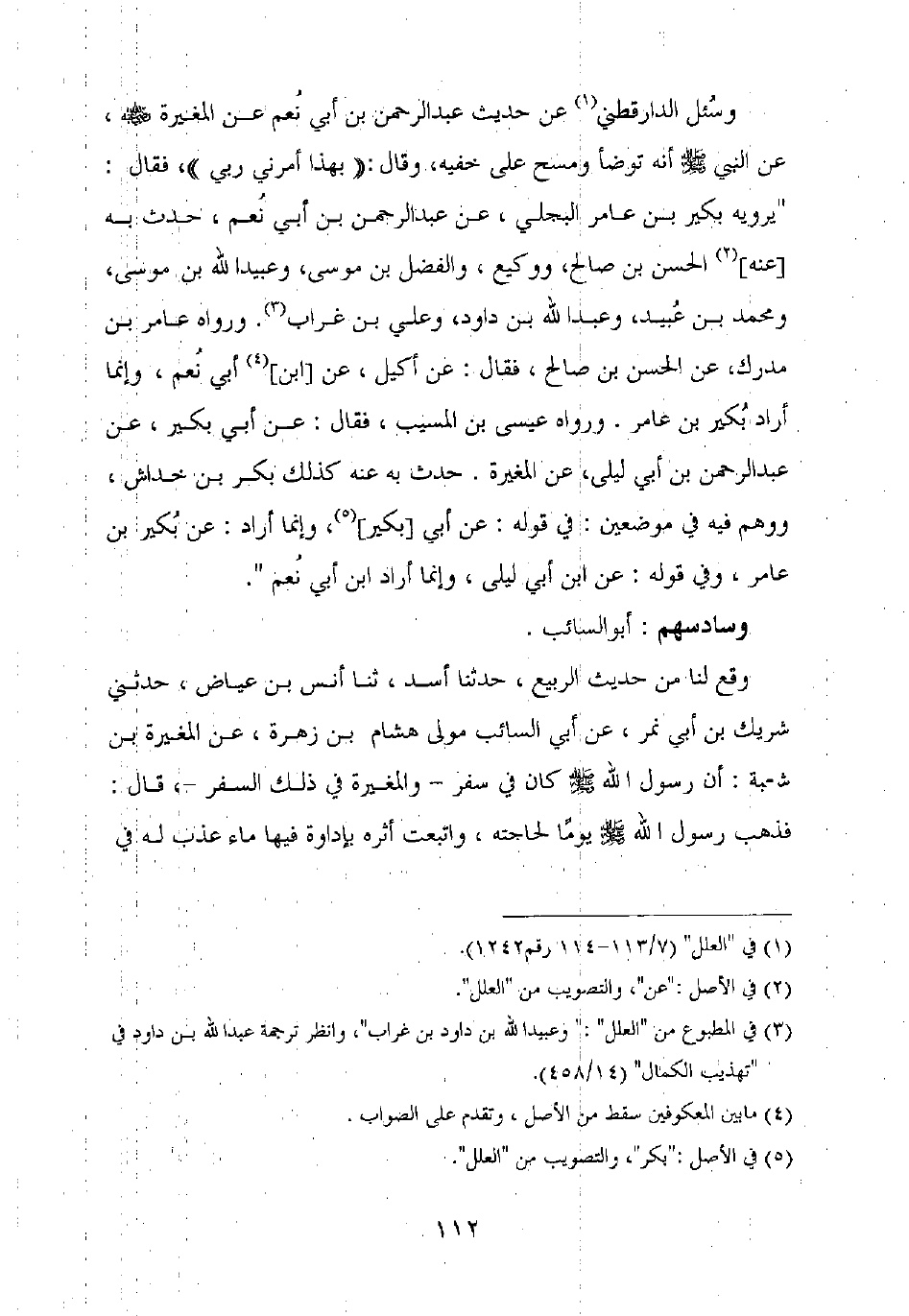 وسئل الدارقطني عن حديث عبد الرحمن بن أبي نعم عن المغيرة رضي الله عنه، عن النبي صلى الله عليه وسلم أنه توضأ ومسح على خفيه، وقال: "بهذا أمرني ربي"، فقال: "يرويه بكير بن عامر البجلي، عن عبد الرحمن بن أبي نعم، حدث به [عنه] الحسن بن صالح، ووكيع، والفضل بن موسى، وعبيد الله بن موسى، ومحمد بن عبيد، وعبد الله بن داود، وعلي بن غراب، ورواه عامر بن مدرك، عن الحسن بن صالح، فقال: عن أكيل، عن [ابن] أبي نعم، وإنما أراد بكير بن عامر. ورواه عيسى بن المسيب، فقال: عن أبي بكير، عن عبد الرحمن بن أبي ليلى، عن المغيرة. حدث به عنه كذلك بكر بن خداش، ووهم فيه في موضعين: في قوله: عن أبي [بكير]، وإنما أراد: عن بكير بن عامر، وفي قوله: عن ابن أبي ليلى، وإنما أراد ابن أبي نعم".