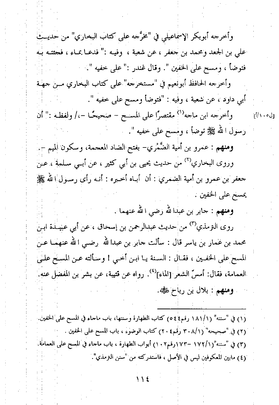 روى الترمذي من حديث عبد الرحمن بن إسحاق، عن أبي عبيدة ابن محمد بن عمار بن ياسر قال: سألت جابر بن عبد الله رضي الله عنهما عن المسح على الخفين، فقال: السنة يا ابن أخي! وسألته عن المسح على العمامة، فقال: أمس الشعر [الماء]. رواه عن قتيبة، عن بشر بن المفضل عنه.