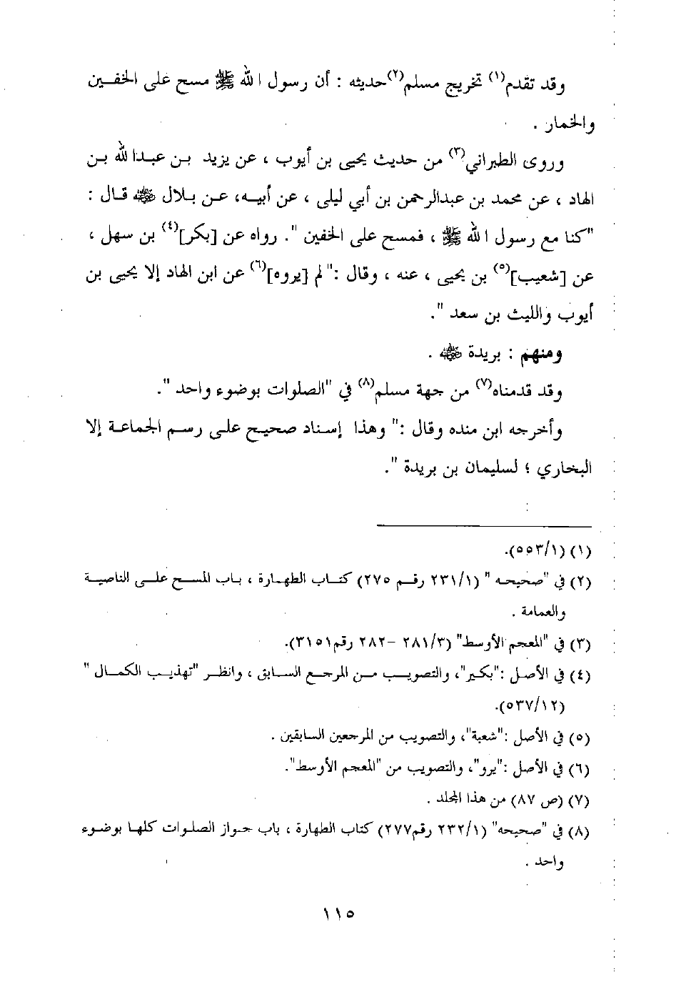 وروى الطبراني من حديث يحيى بن أيوب، عن يزيد بن عبد الله بن الهاد، عن محمد بن عبد الرحمن بن أبي ليلى، عن أبيه، عن بلال رضي الله عنه قال: "كنا مع رسول الله صلى الله عليه وسلم، فمسح على الخفين". رواه عن [بكر] بن سهل، عن [شعيب] بن يحيى، عنه، وقال: "لم [يروه] عن ابن الهاد إلا يحيى بن أيوب والليث بن سعد".