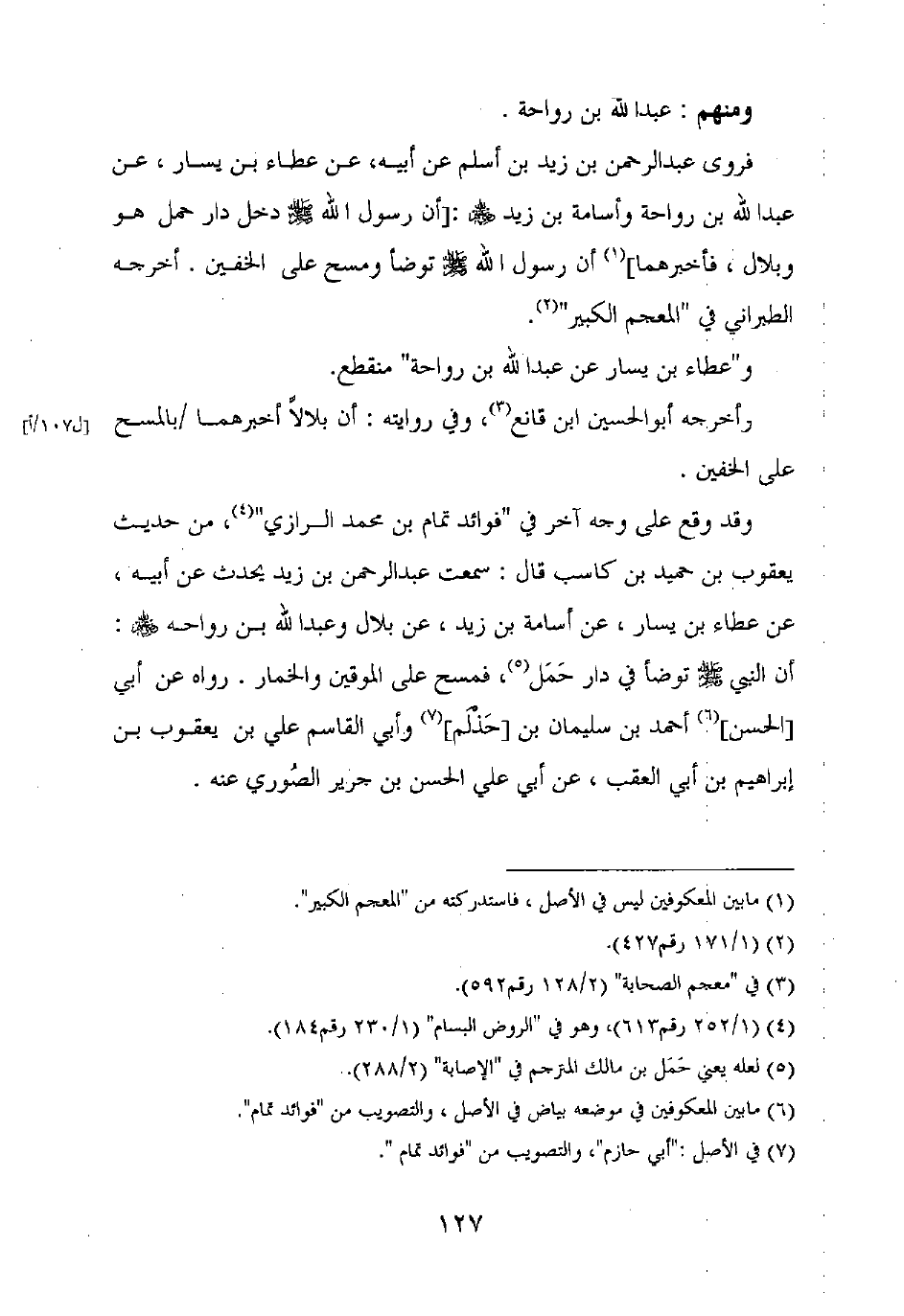فروى عبد الرحمن بن زيد بن أسلم عن أبيه، عن عطاء بن يسار، عن عبد الله بن رواحة وأسامة بن زيد رضي الله عنه: [أن رسول الله صلى الله عليه وسلم دخل دار حمل هو وبلال، فأخبرهما] أن رسول الله صلى الله عليه وسلم توضأ ومسح على الخفين. أخرجه الطبراني في "المعجم الكبير".