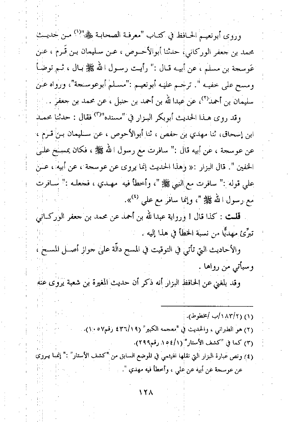 وقد روى هذا الحديث أبو بكر البزار في "مسنده" فقال: حدثنا محمد بن إسحاق، ثنا مهدي بن حفص، ثنا أبو الأحوص، عن سليمان بن قرم، عن عوسجة، عن أبيه قال: "سافرت مع رسول الله صلى الله عليه وسلم، فكان يمسح على الخفين". قال البزار: "وهذا الحديث إنما يروى عن عوسجة، عن أبيه، عن علي قوله: "سافرت مع النبي صلى الله عليه وسلم "، وأخطأ فيه مهدي، فجعله: "سافرت مع رسول الله صلى الله عليه وسلم "، وإنما سافر مع علي ".