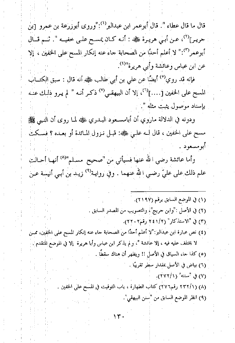 قال ما قال عطاء ". قال أبو عمر ابن عبد البر: "وروى أبو زرعة بن عمرو [بن جرير]، عن أبي هريرة رضي الله عنه: أنه كان يمسح على خفيه". ثم قال أبو عمر: "لا أعلم أحدا من الصحابة جاء عنه إنكار المسح على الخفين، إلا عن ابن عباس وعائشة وأبي هريرة.