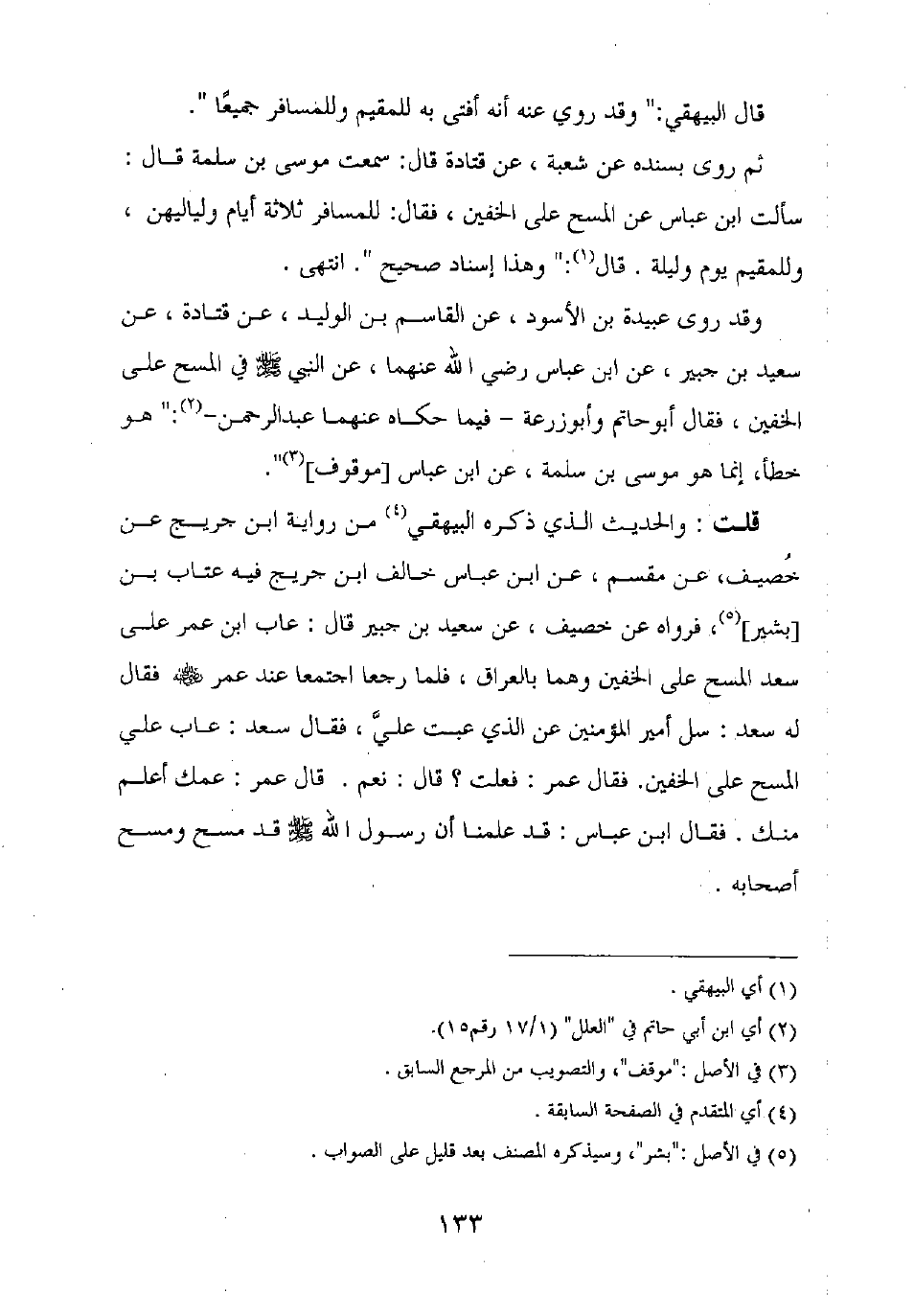 ثم روى بسنده عن شعبة، عن قتادة قال: سمعت موسى بن سلمة قال: سألت ابن عباس عن المسح على الخفين، فقال: للمسافر ثلاثة أيام ولياليهن، وللمقيم يوم وليلة. قال: "وهذا إسناد صحيح". انتهى.