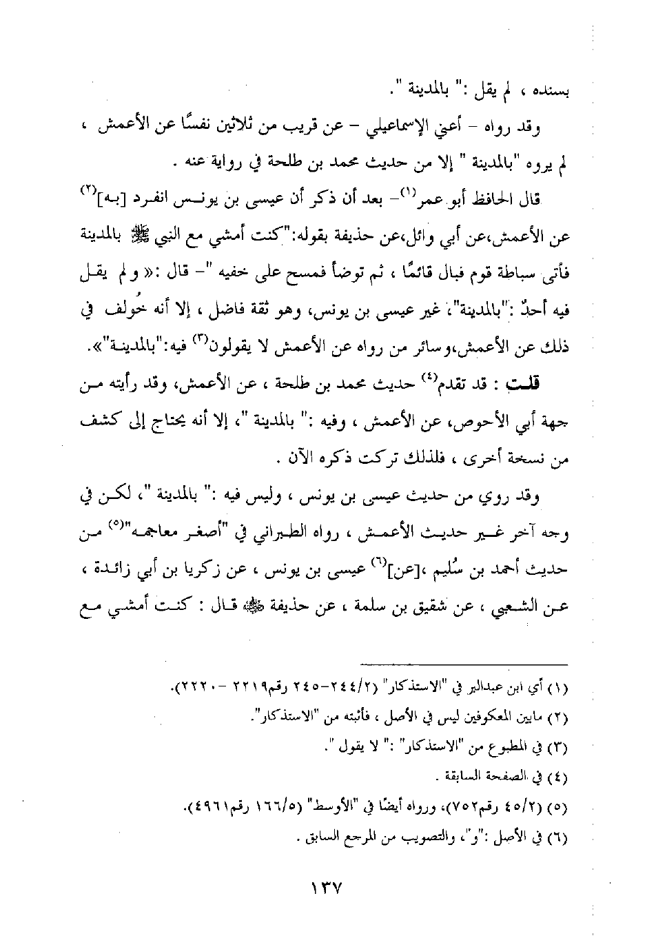 قال الحافظ أبو عمر – بعد أن ذكر أن عيسى بن يونس انفرد [به] عن الأعمش، عن أبي وائل، عن حذيفة بقوله "كنت أمشي مع النبي صلى الله عليه وسلم بالمدينة فأتى سباطة قوم فبال قائما، ثم توضأ فمسح على خفيه" – قال: "ولم يقل فيه أحد: "بالمدينة "، غير عيسى بن يونس، وهو ثقة فاضل، إلا أنه خولف في ذلك عن الأعمش، وسائر من رواه عن الأعمش لا يقولون فيه: "بالمدينة" ".