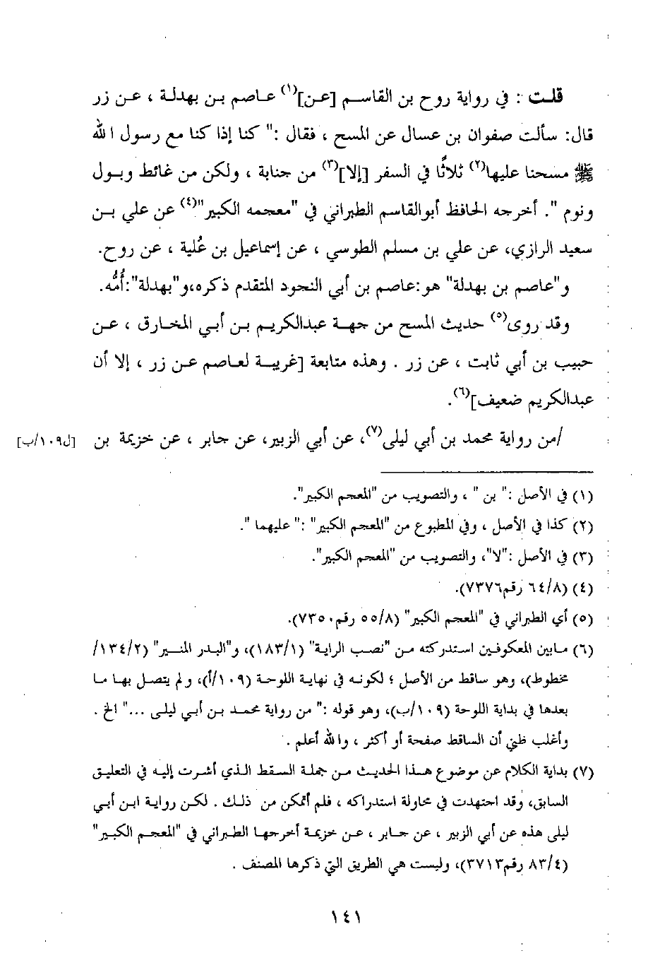 قلت: في رواية روح بن القاسم [عن] عاصم بن بهدلة، عن زر قال: سألت صفوان بن عسال عن المسح، فقال: "كنا إذا كنا مع رسول الله صلى الله عليه وسلم مسحنا عليها ثلاثا في السفر [إلا] من جنابة، ولكن من غائط وبول ونوم". أخرجه الحافظ أبو القاسم الطبراني في "معجمه الكبير" عن علي بن سعيد الرازي، عن علي بن مسلم الطوسي، عن إسماعيل بن علية، عن روح.
