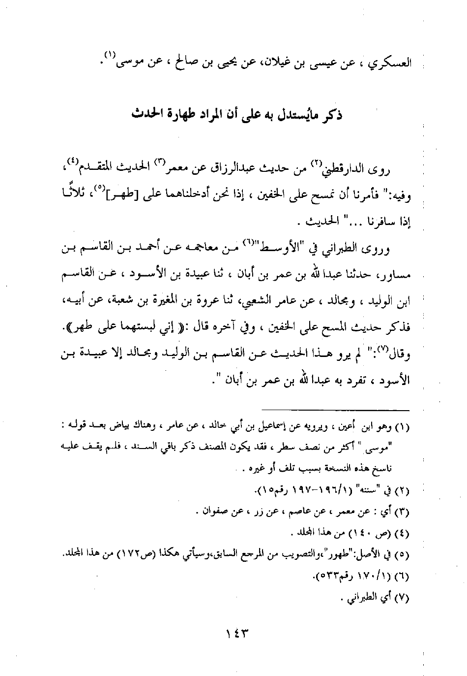 وروى الطبراني في "الأوسط" من معاجمه عن أحمد بن القاسم بن مساور، حدثنا عبد الله بن عمر بن أبان، ثنا عبيدة بن الأسود، عن القاسم بن الوليد، ومجالد، عن عامر الشعبي، ثنا عروة بن المغيرة بن شعبة، عن أبيه، فذكر حديث المسح على الخفين، وفي آخره قال: "إني لبستهما على طهر".