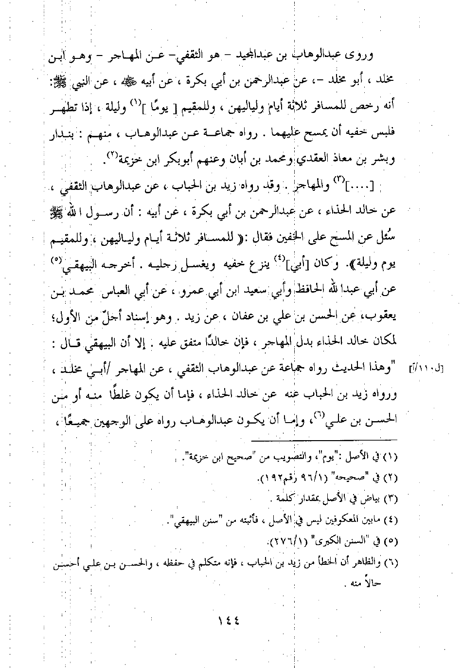 [ ..... ] والمهاجر. وقد رواه زيد بن الحباب، عن عبد الوهاب الثقفي، عن خالد الحذاء، عن عبد الرحمن بن أبي بكرة، عن أبيه: أن رسول الله صلى الله عليه وسلم سئل عن المسح على الخفين فقال: "للمسافر ثلاثة أيام ولياليهن، وللمقيم يوم وليلة". وكان [أبي] ينزع خفيه ويغسل رجليه. أخرجه البيهقي عن أبي عبد الله الحافظ وأبي سعيد ابن أبي عمرو، عن أبي العباس محمد بن يعقوب، عن الحسن بن علي بن عفان، عن زيد. وهو إسناد أجل من الأول، لمكان خالد الحذاء بدل المهاجر، فإن خالدا متفق عليه. إلا أن البيهقي قال: "وهذا الحديث رواه جماعة عن عبد الوهاب الثقفي، عن المهاجر أبي مخلد، ورواه زيد بن الحباب عنه عن خالد الحذاء، فإما أن يكون غلطا منه أو من الحسن بن علي، وإما أن يكون عبد الوهاب رواه على الوجهين جميعا،