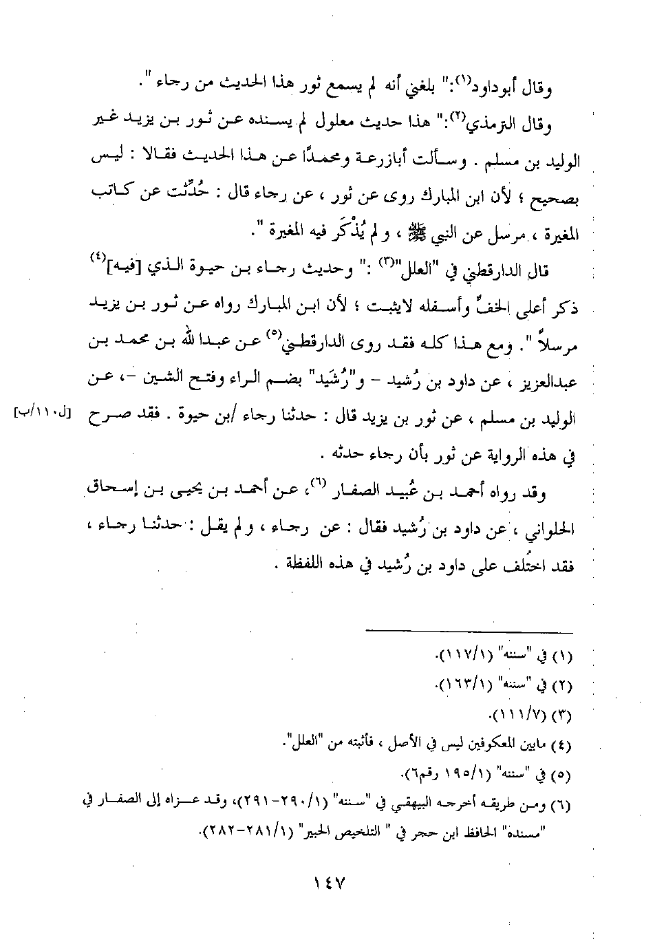 قال الدارقطني في "العلل": "وحديت رجاء بن حيوة الذي [فيه] ذكر أعلى الخف وأسفله لا يثبت، لأن ابن المبارك رواه عن ثور بن يزيد مرسلا". ومع هذا كله فقد روى الدارقطني عن عبد الله بن محمد بن عبد العزيز، عن داود بن رشيد - و"رشيد" بضم الراء وفتح الشين –، عن الوليد بن مسلم، عن ثور بن يزيد قال: حدثنا رجاء بن حيوة. فقد صرح في هذه الرواية عن ثور بأن رجاء حدثه.
