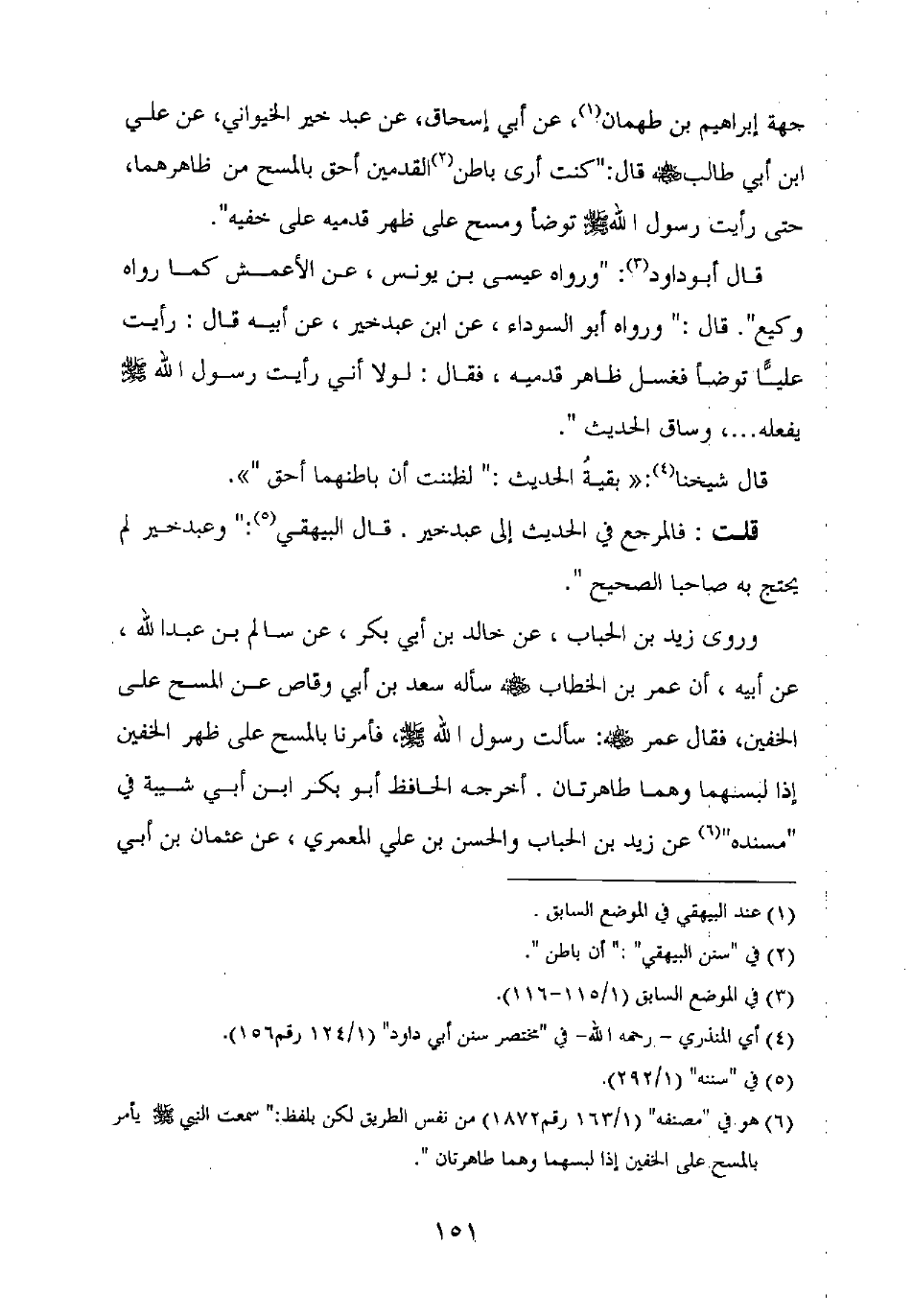 جهة إبراهيم بن طهمان، عن أبي إسحاق، عن عبد خير الخيواني، عن علي بن أبي طالب رضي الله عنه قال: "كنت أرى باطن القدمين أحق بالمسح من ظاهرهما، حتى رأيت رسول الله صلى الله عليه وسلم توضأ ومسح على ظهر قدميه على خفيه".