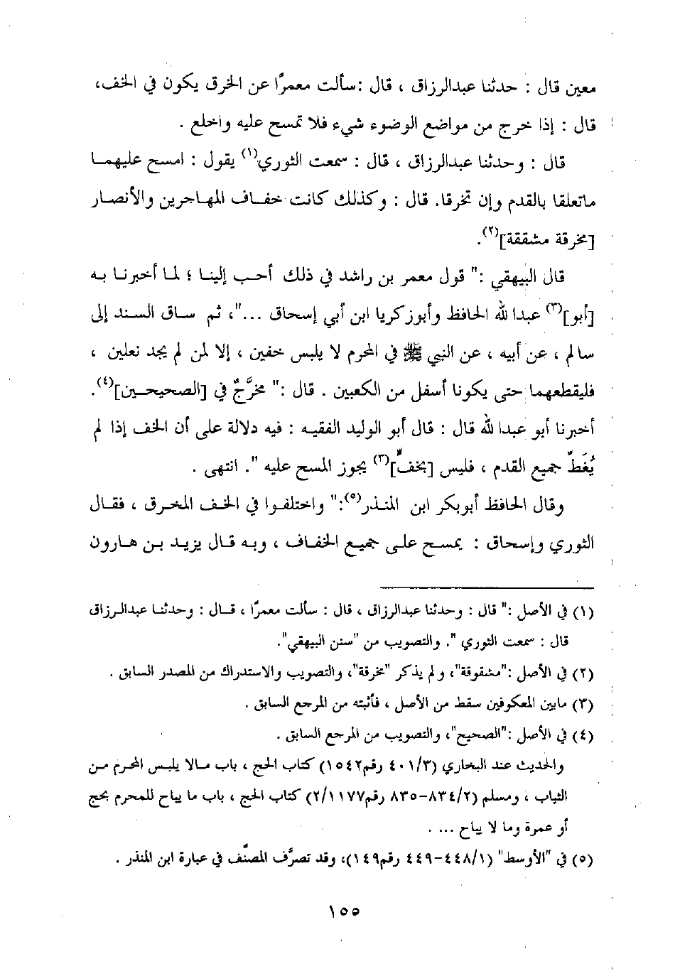 قال: وحدثنا عبد الرزاق، قال: سمعت الثوري يقول: امسح عليهما ما تعلقا بالقدم وإن تخرقا. قال: وكذلك كانت خفاف المهاجرين والأنصار [مخرقة مشققة].