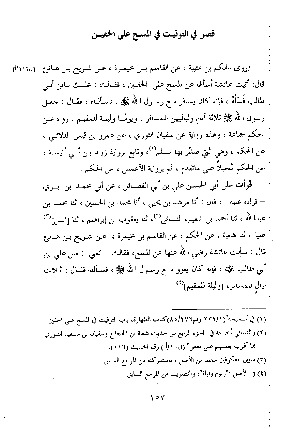 قرأت على أبي الحسن علي بن أبي الفضائل، عن أبي محمد ابن بري – قراءة عليه –، قال: أنا مرشد بن يحيى، أنا محمد بن الحسين، ثنا محمد بن عبد الله، ثنا أحمد بن شعيب النسائي، ثنا يعقوب بن إبراهيم، ثنا [ابن] علية، ثنا شعبة، عن الحكم، عن القاسم بن مخيمرة، عن شريح بن هانئ قال: سألت عائشة رضي الله عنها عن المسح، فقالت – تعني –: سل علي بن أبي طالب رضي الله عنه، فإنه كان يغزو مع رسول الله صلى الله عليه وسلم، فسألته فقال: ثلاث ليال للمسافر [وليلة للمقيم].