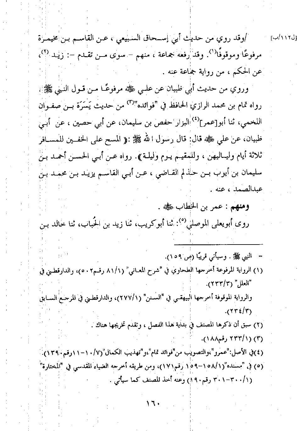 رواه تمام بن محمد الرازي الحافظ في "فوائدة" من حديث يسرة بن صفوان اللخمي، ثنا أبو [عمر] البزار حفص بن سليمان، عن أبي حصين، عن أبي ظبيان، عن علي رضي الله عنه قال: قال رسول الله صلى الله عليه وسلم: "المسح على الخفين للمسافر ثلاثة أيام ولياليهن، وللمقيم يوم وليلة". رواه عن أبي الحسن أحمد بن سليمان بن أيوب بن حذلم القاضي، عن أبي القاسم يزيد بن محمد بن عبد الصمد، عنه.